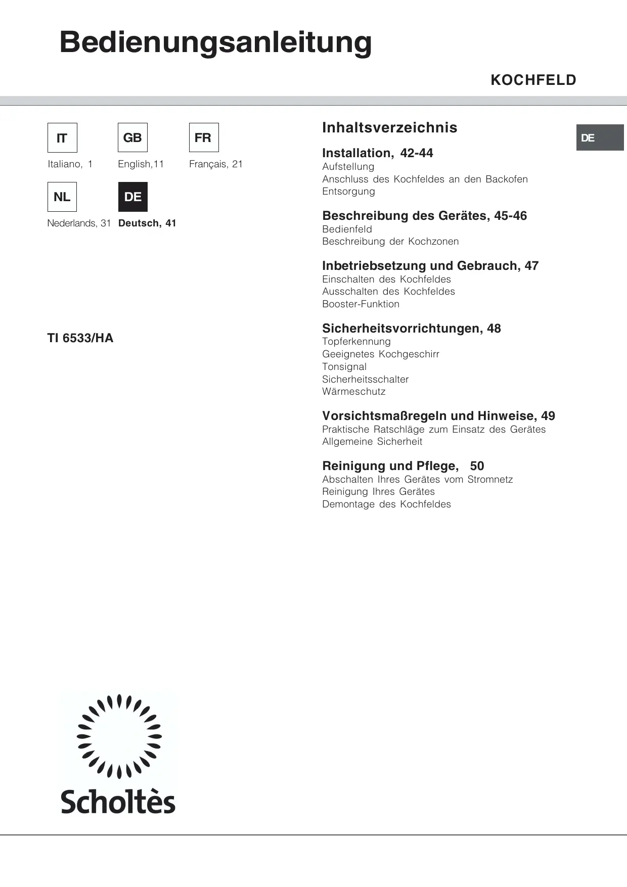 Français, 21 Inhaltsverzeichnis Installation, 42-44 Aufstellung Anschluss des Kochfeldes an den Backofen Entsorgung Beschreibung des Gerätes, 45-46 Bedienfeld Beschreibung der Kochzonen Inbetriebsetzung und Gebrauch, 47 Einschalten des Kochfeldes Ausschalten des Kochfeldes Booster-Funktion TI 6533/HA Sicherheitsvorrichtungen, 48 Topferkennung Geeignetes Kochgeschirr Tonsignal Sicherheitsschalter Wärmeschutz Vorsichtsmaßregeln und Hinweise, 49 Praktische Ratschläge zum Einsatz des Gerätes Allgemeine Sicherheit Reinigung und Pflege, 50 Abschalten Ihres Gerätes vom Stromnetz Reinigung Ihres Gerätes Demontage des Kochfeldes
