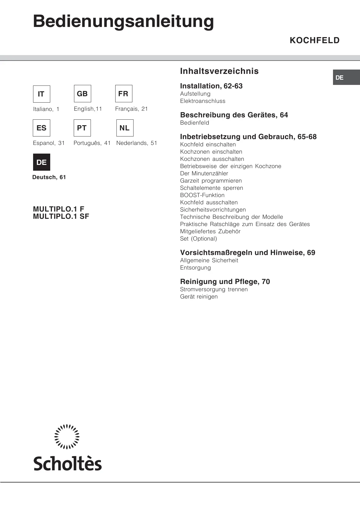 Deutsch, 61 MULTIPLO.1 F MULTIPLO.1 SF Aufstellung Elektroanschluss Beschreibung des Gerätes, 64 Bedienfeld Inbetriebsetzung und Gebrauch, 65-68 Kochfeld einschalten Kochzonen einschalten Kochzonen ausschalten Betriebsweise der einzigen Kochzone Der Minutenzähler Garzeit programmieren Schaltelemente sperren BOOST-Funktion Kochfeld ausschalten Sicherheitsvorrichtungen Technische Beschreibung der Modelle Praktische Ratschläge zum Einsatz des Gerätes Mitgeliefertes Zubehör Set (Optional) Vorsichtsmaßregeln und Hinweise, 69 Allgemeine Sicherheit Entsorgung Reinigung und Pflege, 70 Stromversorgung trennen Gerät reinigen