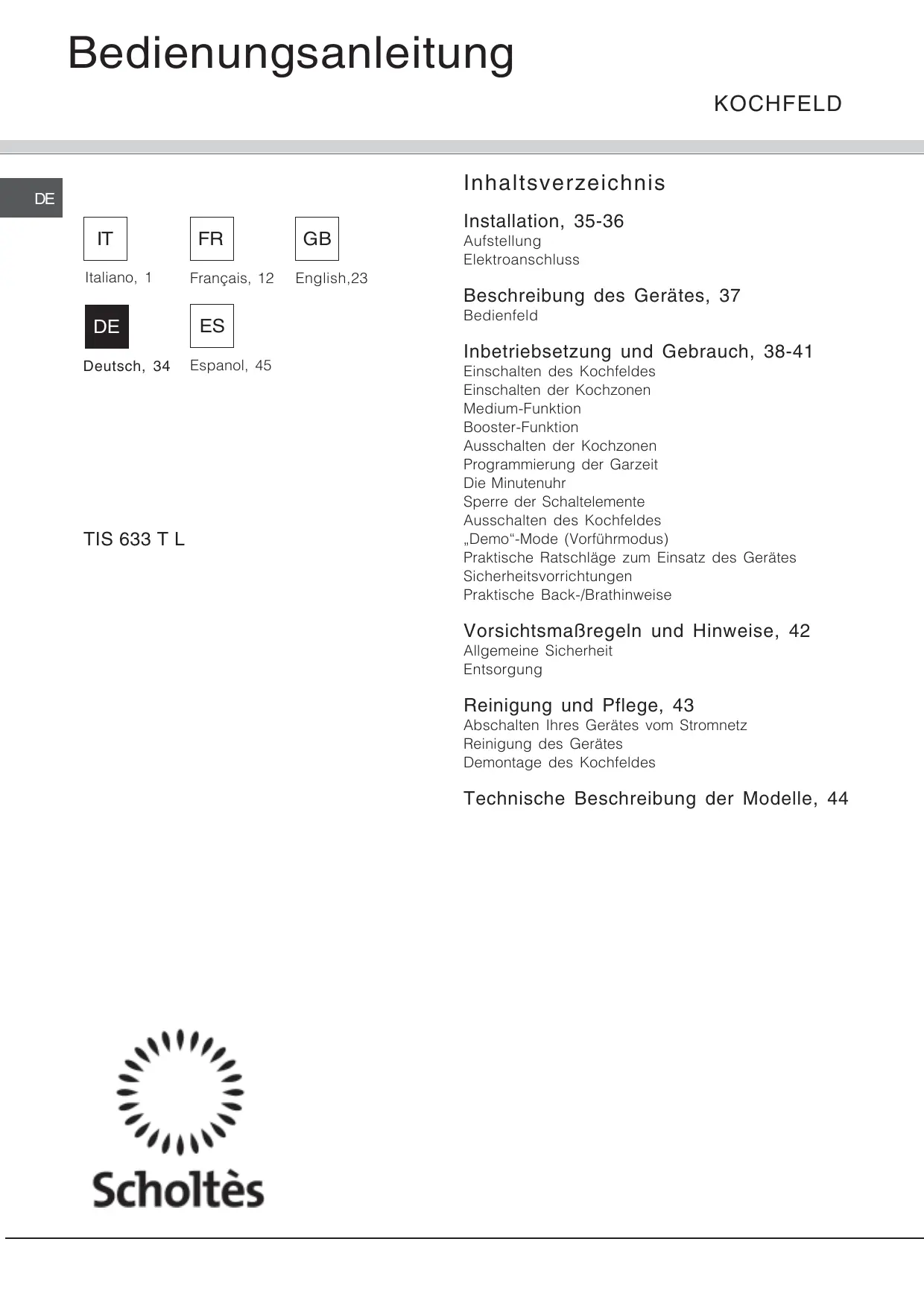 TIS 633 T L - Kochfeld SCHOLTES - Kostenlose Bedienungsanleitung