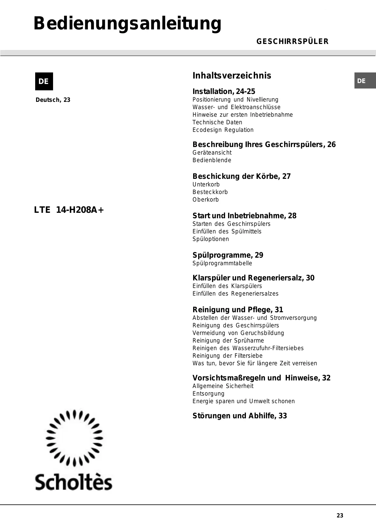 LTE 14-H208 A .R - Geschirrspüler SCHOLTES - Kostenlose Bedienungsanleitung