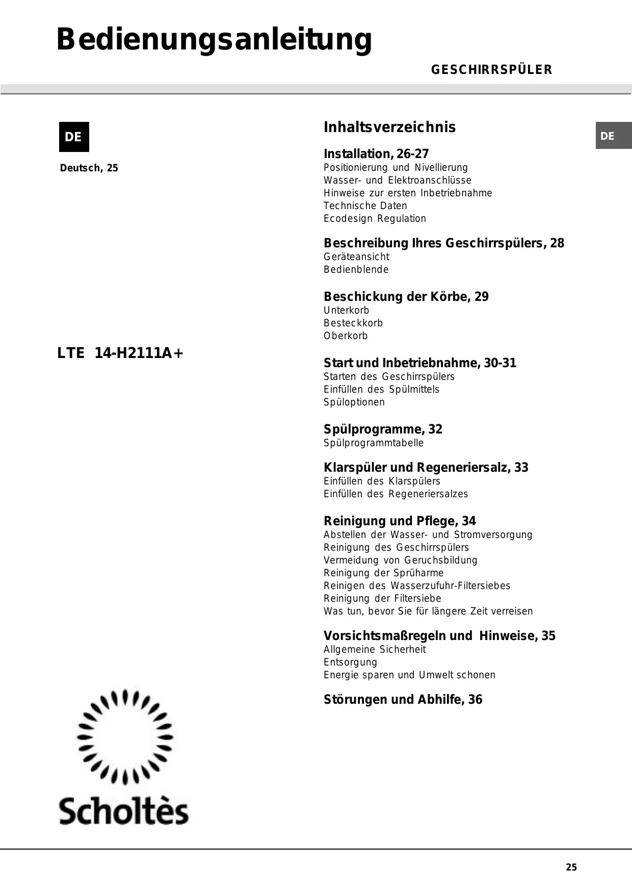 LTE 14-H2111 A .R - Geschirrspüler SCHOLTES - Kostenlose Bedienungsanleitung