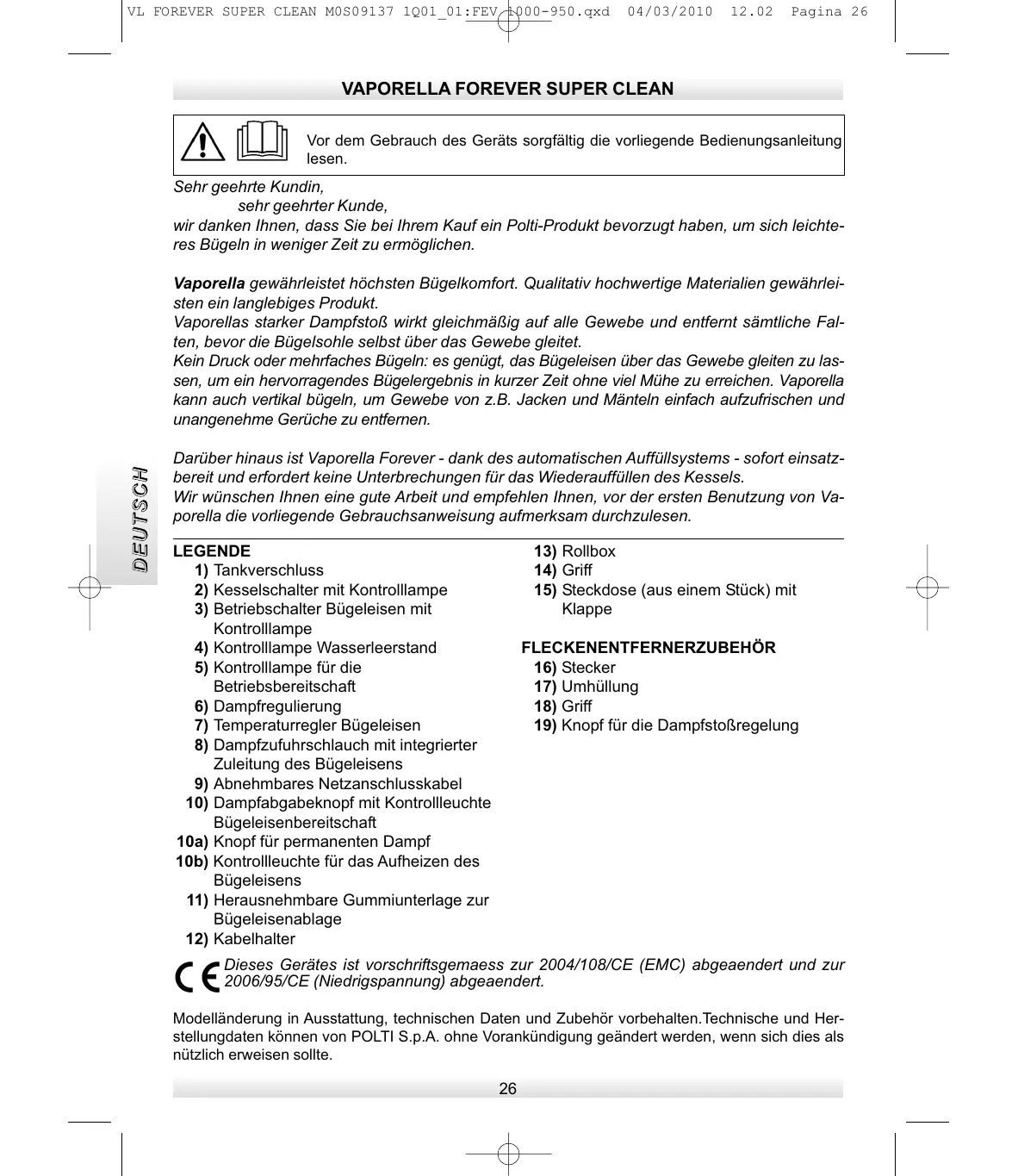 Dieses Gerätes ist vorschriftsgemaess zur 2004/108/CE (EMC) abgeaendert und zur 2006/95/CE (Niedrigspannung) abgeaendert. Modelländerung in Ausstattung, technischen Daten und Zubehör vorbehalten.Technische und Herstellungdaten können von POLTI S.p.A. ohne Vorankündigung geändert werden, wenn sich dies als nützlich erweisen sollte.