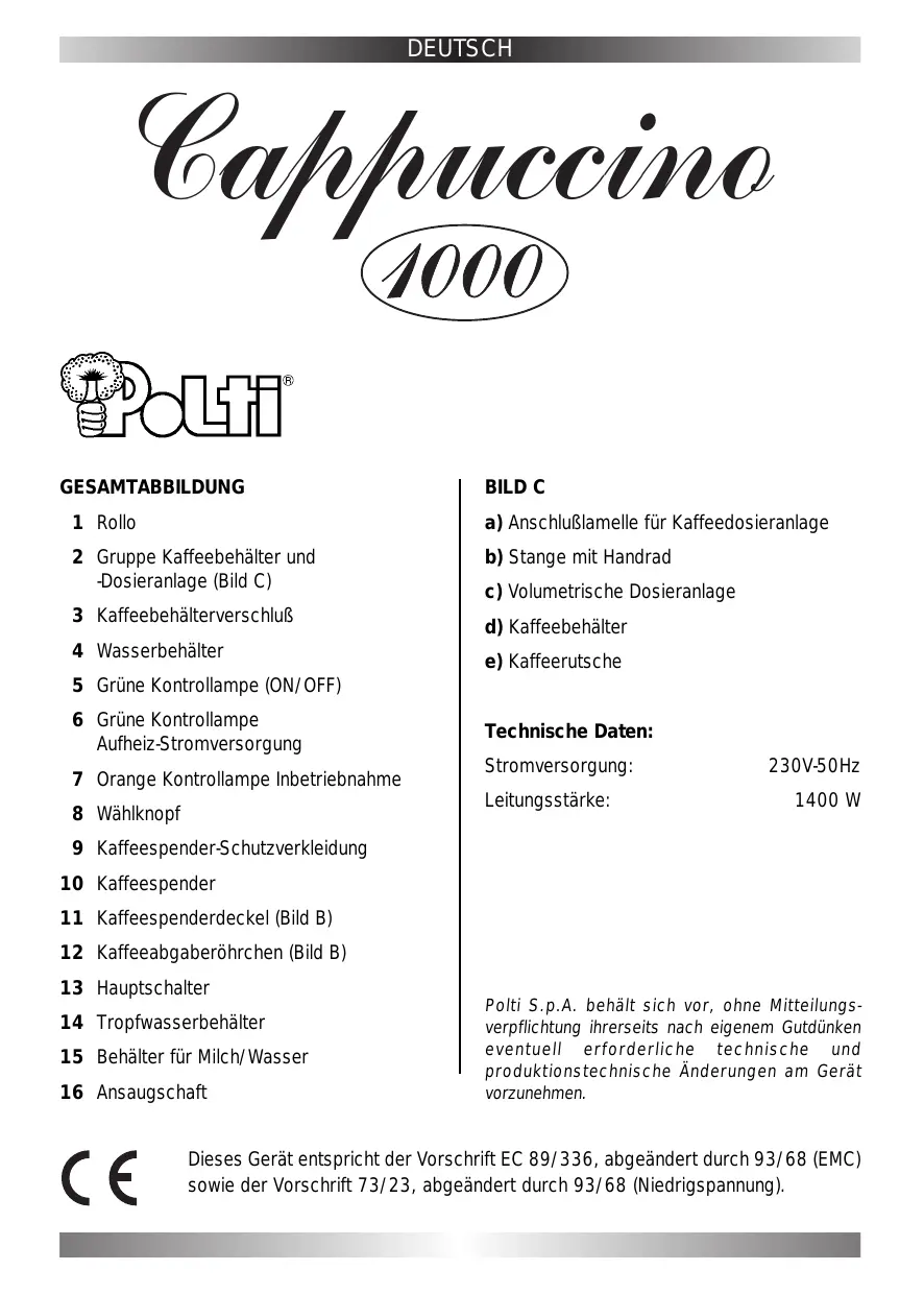 - Ihr Kaffee gelingt noch aromatischer, wenn Sie anstelle von Leitungswasser Mineralwasser verwenden (ohne Kohlensäure). DEUTSCH GARANTIE Polti gewährt Ihnen 1 Jahr Garantie auf CAPPUCCINO POLTI ab Verkaufsdatum gegen Verarbeitungs- oder Materialfehlern. Ausgenommen sind Schäden, die durch unsachgemäße Handhabung entstehen. Bei Beanstandungen bitten wir Sie, das Gerät sofort an die nächstgelegene Polti-Kundendienststelle zu senden. Kein Garantieanspruch für Folgeschäden durch unsachgemäße Handhabung. POLTI S.p.A. übernimmt keinerlei Haftung für Unfälle, die auf unsachmäßigen, dieser Gebrauchsanleitung nicht entsprechenden Einsatz des CAPPUCCINO 1000-Gerätes zurückzuführen sind. WICHTIG! Das Gerät wurde gemäß den gesetzlichen Richtlinien für das Recycling gebaut. Es empfehlt sich, Überreste der für den Transport bestimmten Schutzverpackungs materialien nicht im Haushaltsmüll zu entsorgen, sondern vielmehr diese an geeignete Sammelstellen auszuliefern. HINWEISE FÜR DIE LÖSUNG EVENTUELLER PROBLEME PROBLEM URSACHE LÖSUNG Die Ausgabe beginnt nicht Im Kessel Nr. 4 fehlt oder unterbricht sich Wasser Mit Wasser füllen Stürmische Ausgabe mit Auslauf von Dampf Die Milch oder das Wasser sind nicht kalt genug Milch oder Wasser mit Kühlschranktemperatur benutzen (cirka 10°C) Fehlende Kaffeeausgabe Im Behälter fehlt Kaffee. Die Dosiergruppe ist verkrustet Den Behälter füllen. Den Kaffeebehälter reinigen (Anweisung beachten) Der Betriebszyklus fängt nicht an Der Kaffeebehälterverschluß (3) ist nicht korrekt geschlossen Den Verschluß korrekt in seinem Sitz unterbringen Die Ausgabe beginnt nicht und man hört ein Ticken Die Kaffeedosiergruppe (Nr. 2) ist verkrustet Reinigung durchführen, wie im Absatz REINIGUNG DER KAFFEEDOSIER GRUPPE beschrieben ENGLISH Cappuccino KEY FIG. C 1 Rolltop cover a) Coffee measuring device link plates 2 Coffee container and coffee measure unit (Fig. C) b) Rod with handwheel 3 Coffee container cover 4 Water container c) Volumetric measure device d) Coffee container e) Coffee slide 5 ON/OFF green pilot light 6 Heating/power supply green pilot light 7 Operation orange pilot light 8 Selection knob Technical characteristics: Power supply: Installed power: 220/240V-50Hz 1400 W 9 Dispenser cover 10 Dispenser ring 11 Dispenser cap (fig.B) 12 Dispenser tube 13 Main switch 14 Liquid collector tray 15 Milk/water container 16 Milk suction tube Polti S.p.A. reserves the right to change specifications without prior notice. This appliance conforms to EC Directive 89/336 amended by 93/68 (EMC) and to Directive 73/23 amended by 93/68 (low voltage) ENGLISH PRECAUTIONS Attention! Do not use the appliance without reading the instructions.