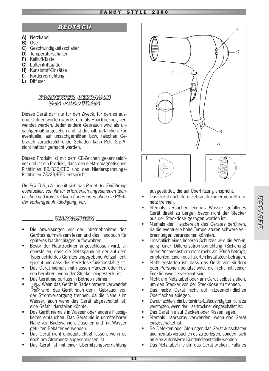 Dieses Geratarfurdur fur den Zweck, fur den es ausdrucklich entworen wurde, d.h. als Haartrockner, verwendert werden. Jeder andere Gebrauch wird als unsachgemäß angesehen und ist deshalb gefährlich. Für eventuelle, auf unsachgemüssen bzw.falschen Gebrauch zurückzuführende Schaden kann Polti S.p.A. nicht haftbar gemacht werden.