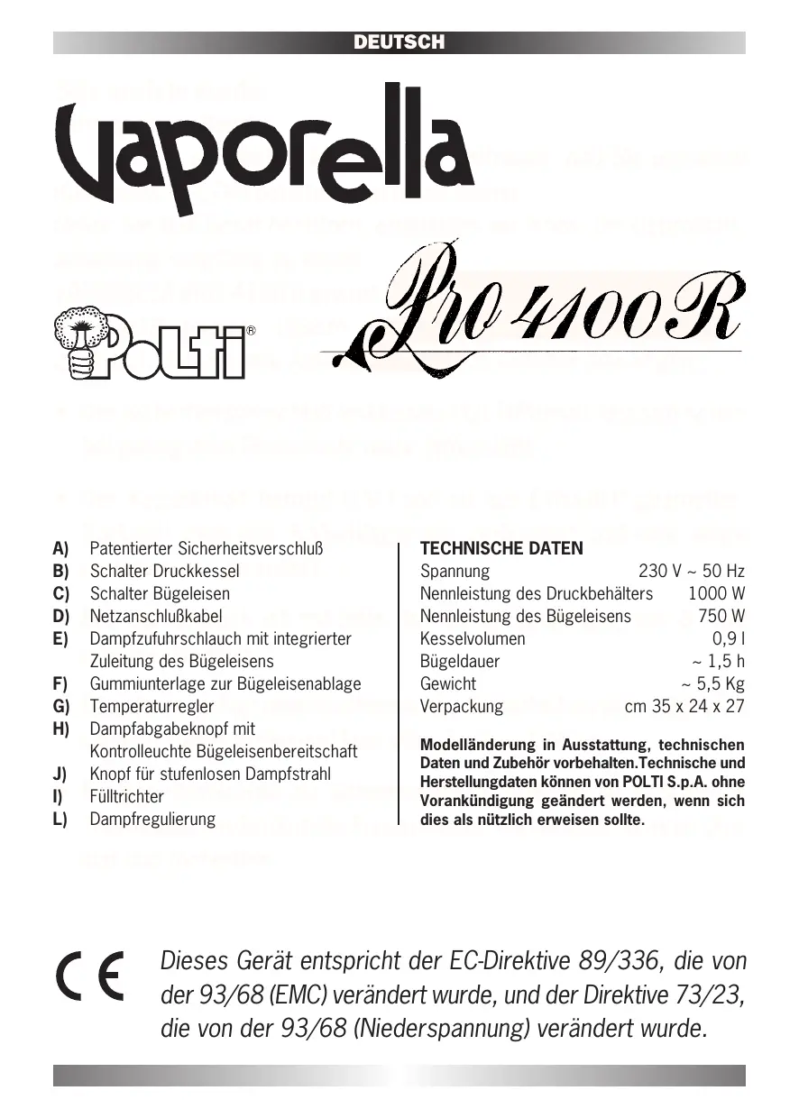 - encombrement minimum quand elle est fermée. DEMANDEZ A UN REVENDEUR DE FAIRE LA DEMONSTRATION DE LA STIRO PROFESSIONAL, IL SERA HEUREUX DE VOUS PRESENTER UN REPASSAGE PARFAIT. DEUTSCH Sehr geehrte Kundin, sehr geehrter Kunde, wir danken Ihnen für das Vertrauen, daß Sie uns beim Kauf eines POLTI-Produktes geschenkt haben. Bevor Sie das Gerät benutzen, empfehlen wir Ihnen, die Gebrauchsanweisung sorgfältig zu lesen. VAPORELLA PRO 4100 R gehört zu den modernsten Geräten der Professional-Bügeleisen. Unsere Techniker haben dieses Gerät so ausgestattet, daß Sie ihre Arbeit effizienter un sicherer bewältigen: