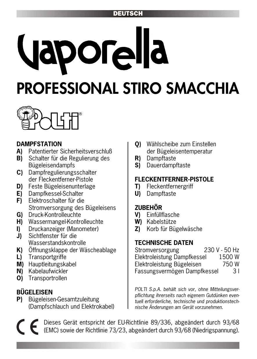 W) Kabelstütze Z) Korb für Bügelwäsche TECHNISCHE DATEN Stromversorgung 230 V - 50 Hz Elektroleistung Dampfkessel 1500 W Elektroleistung Bügeleisen 750 W Fassungsvermögen Dampfkessel POLTI S.p.A. behält sich vor, ohne Mitteilungsverpflichtung ihrerseits nach eigenem Gutdünken eventuell erforderliche, technische und produktionstechnische Änderungen am Gerät vorzunehmen. Dieses Gerät entspricht der EU-Richtlinie 89/336, abgeändert durch 93/68 (EMC) sowie der Richtlinie 73/23, abgeändert durch 93/68 (Niedrigspannung). DEUTSCH Sehr geehrte Kundin, Wir bedanken uns dafür, daß Sie bei Ihrem Kauf ein Polti-Produkt bevorzugt haben. Vaporella Professional Stiro Smacchia ist ein komplettes, professionelles Bügelcenter für den Haushalt, ausgestattet mit einer leistungsstarken FleckentfernerDampfpistole, die auch gegen solche Flecken vorgeht, die bis gestern nur in der chemischen Reinigung zu beseitigen waren. Wir empfehlen Ihnen, diese Gebrauchsanleitung aufmerksam durchzulesen. Sie enthält wichtige Hinweise und Ratschläge, die es Ihnen ermöglichen, die Qualität Ihres neuen Haushaltsgeräts voll zu nutzen. V O R D E M E I N S AT Z D E S G E R Ä T S I S T F O L G E N D E S Z U B E A C H T E N