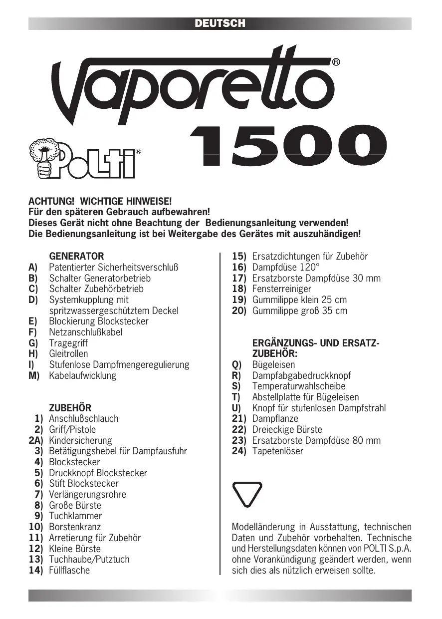 BEDIENUNGSANLEITUNG VAPORETTO 1500 POLTI