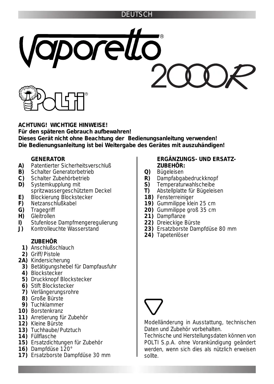 18) 19) 20) 21) 22) 23) 24) ERGÄNZUNGS- UND ERSATZZUBEHÖR: Bügeleisen Dampfabgabedruckknopf Temperaturwahlscheibe Abstellplatte für Bügeleisen Fensterreiniger Gummilippe klein 25 cm Gummilippe groß 35 cm Dampflanze Dreieckige Bürste Ersatzborste Dampfdüse 80 mm Tapetenlöser Modelländerung in Ausstattung, technischen Daten und Zubehör vorbehalten. Technische und Herstellungsdaten können von POLTI S.p.A. ohne Vorankündigung geändert werden, wenn sich dies als nützlich erweisen sollte. DEUTSCH TECHNISCHE DATEN Nennspannung 230V Nennfrequenz 50 Hz Nennaufnahme 1500 W Behälterinhalt 1,5 l zulässiger max. Betriebsüberdruck 4 bar Maximumdruck 5 bar Bügelsystem (Ergänzungs-Zubehör): Nennspannung 230V Nennfrequenz 50 Hz Nennaufnahme 750 W GERÄUSCHENTWICKLUNG Der arbeitsplatzbezogene Emissionswert des Gerätes ist kleiner als 70 dB (A). BITTE BEACHTEN ! Lesen Sie vor Inbetriebnahme diese Bedienungsanleitung sorgfältig durch, um Schäden und Gefahren durch nicht ordnunggemäßen Gebrauch zu vermeiden. Bewahren Sie die Bedienungsanleitung gut auf, damit Sie jederzeit einzeine Punkte nachlesen können. Bei der Weitergabe des Gerätes an andere Personen muß die Bedienungsanleitung mit ausgehändigt werden. Beachten Sie besonders die mit gekennzeichneten Sicherheitshinweise. Mit dem Vaporetto-Dampfreiniger haben Sie sich für schadstoffreie, umweltschonende Sauberkeit und Polti-perfekte Sicherheit entschieden: