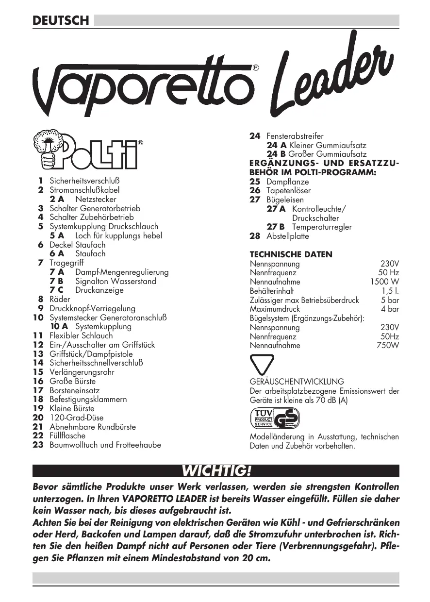 Ce bidon avec son système de trop-plein automatique permet de remplir la chaudière du VAPORETTO avec juste la quantité d’eau nécessaire. DEUTSCH 1 Sicherheitsverschluß 2 Stromanschlußkabel 2 A Netzstecker 3 Schalter Generatorbetrieb 4 Schalter Zubehörbetrieb 5 Systemkupplung Druckschlauch 5 A Loch für kupplungs hebel 6 Deckel Staufach 6 A Staufach 7 Tragegriff 7 A Dampf-Mengenregulierung 7 B Signalton Wasserstand Druckanzeige 8 Räder 9 Druckknopf-Verriegelung 10 Systemstecker Generatoranschluß 10 A Systemkupplung 11 Flexibler Schlauch 12 Ein-/Ausschalter am Griffstück 13 Griffstück/Dampfpistole 14 Sicherheitsschnellverschluß 15 Verlängerungsrohr 16 Große Bürste 17 Borsteneinsatz 18 Befestigungsklammern 19 Kleine Bürste 20 120-Grad-Düse 21 Abnehmbare Rundbürste 22 Füllflasche 23 Baumwolltuch und Frotteehaube 24 Fensterabstreifer 24 A Kleiner Gummiaufsatz 24 B Großer Gummiaufsatz ERGÄNZUNGS- UND ERSATZZUBEHÖR IM POLTI-PROGRAMM: 25 Dampflanze 26 Tapetenlöser 27 Bügeleisen 27 A Kontrolleuchte/ Druckschalter 27 B Temperaturregler 28 Abstellplatte TECHNISCHE DATEN Nennspannung 230V Nennfrequenz 50 Hz Nennaufnahme 1500 W Behälterinhalt 1,5 l. Zulässiger max Betriebsüberdruck 5 bar Maximumdruck 4 bar Bügelsystem (Ergänzungs-Zubehör): Nennspannung 230V Nennfrequenz 50Hz Nennaufnahme 750W GERÄUSCHENTWICKLUNG Der arbeitsplatzbezogene Emissionswert der Geräte ist kleine als 70 dB (A) Modelländerung in Ausstattung, technischen Daten und Zubehör vorbehalten. WICHTIG! Bevor sämtliche Produkte unser Werk verlassen, werden sie strengsten Kontrollen unterzogen. In Ihren VAPORETTO LEADER ist bereits Wasser eingefüllt. Füllen sie daher kein Wasser nach, bis dieses aufgebraucht ist. Achten Sie bei der Reinigung von elektrischen Geräten wie Kühl - und Gefrierschränken oder Herd, Backofen und Lampen darauf, daß die Stromzufuhr unterbrochen ist. Richten Sie den heißen Dampf nicht auf Personen oder Tiere (Verbrennungsgefahr). Pflegen Sie Pflanzen mit einem Mindestabstand von 20 cm. DEUTSCH INBETRIEBNAHME GENERATOR FIG. A FIG. 1