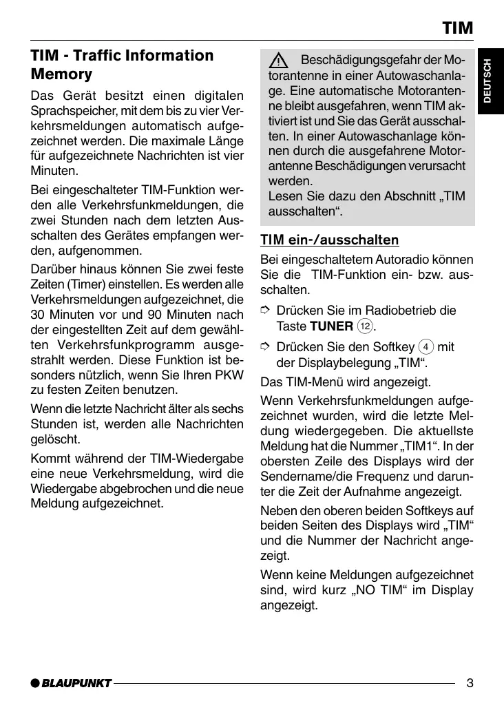 TIM DEUTSCH TIM - Traffic Information Memory ... 3 TIM ein-/ausschalten 3 Gespeicherte Verkehrsmeldungen abhören 4 Aufzeichnen von Verkehrsnachrichten 5 Timer setzen 5 Timer wählen 6