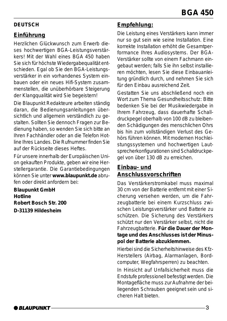 Herzlichen Glückwunsch zum Erwerb dieses hochwertigen BGA-Leistungsverstärkers! Mit der Wahl eines BGA 450 haben Sie sich für höchste Wiedergabequalität entschieden. Egal ob Sie den BGA-Leistungsverstärker in ein vorhandenes System einbauen oder ein neues Hifi-System zusammenstellen, die unüberhörbare Steigerung der Klangqualität wird Sie begeistern! Die Blaupunkt Redakteure arbeiten ständig daran, die Bedienungsanleitungen übersichtlich und allgemein verständlich zu gestalten. Sollten Sie dennoch Fragen zur Bedienung haben, so wenden Sie sich bitte an Ihren Fachhändler oder an die Telefon Hotline Ihres Landes. Die Rufnummer finden Sie auf der Rückseite dieses Heftes. Für unsere innerhalb der Europäischen Union gekauften Produkte, geben wir eine Herstellergarantie. Die Garantiebedingungen können Sie unter www.blaupunkt.de abrufen oder direkt anfordern bei: Blaupunkt GmbH Hotline Robert Bosch Str. 200 D-31139 Hildesheim