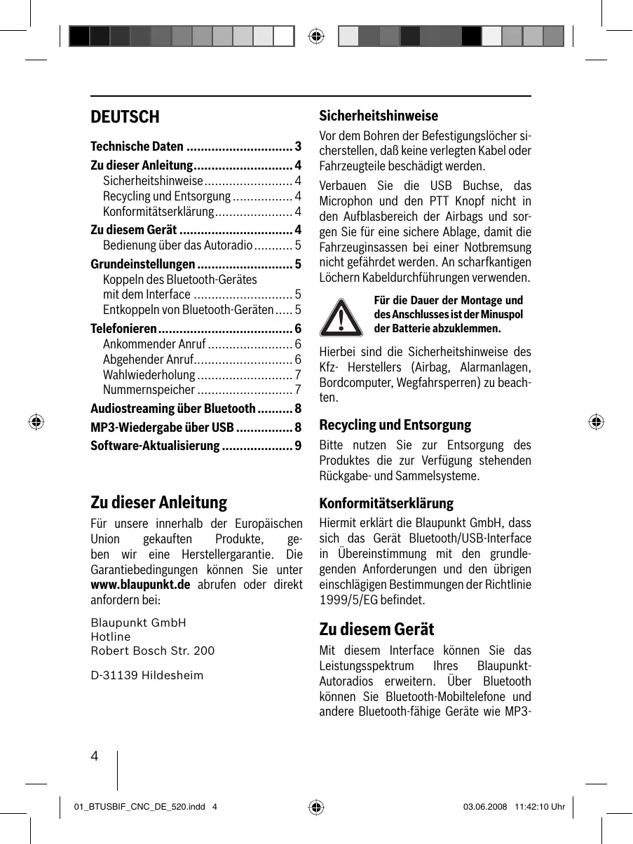 - Software-Aktualisierung Sicherheitshinweise Vor dem Bohren der Befestigungslöcher sicherstellen, daß keine verlegten Kabel oder Fahrzeugteile beschädigt werden. Verbauen Sie die USB Buchse, das Microphon und den PTT Knopf nicht in den Aufblasbereich der Airbags und sorgen Sie für eine sichere Ablage, damit die Fahrzeuginsassen bei einer Notbremsung nicht gefährdet werden. An scharfkantigen Löchern Kabeldurchführungen verwenden. Für die Dauer der Montage und des Anschlusses ist der Minuspol der Batterie abzuklemmen. Hierbei sind die Sicherheitshinweise des Kfz- Herstellers (Airbag, Alarmanlagen, Bordcomputer, Wegfahrsperren) zu beachten. Recycling und Entsorgung Bitte nutzen Sie zur Entsorgung des Produktes die zur Verfügung stehenden Rückgabe- und Sammelsysteme. Zu dieser Anleitung Konformitätserklärung Für unsere innerhalb der Europäischen Union gekauften Produkte, geben wir eine Herstellergarantie. Die Garantiebedingungen können Sie unter www.blaupunkt.de abrufen oder direkt anfordern bei: Hiermit erklärt die Blaupunkt GmbH, dass sich das Gerät Bluetooth/USB-Interface in Übereinstimmung mit den grundlegenden Anforderungen und den übrigen einschlägigen Bestimmungen der Richtlinie 1999/5/EG befindet. Blaupunkt GmbH Hotline Robert Bosch Str. 200 Zu diesem Gerät D-31139 Hildesheim Mit diesem Interface können Sie das Leistungsspektrum Ihres BlaupunktAutoradios erweitern. Über Bluetooth können Sie Bluetooth-Mobiltelefone und andere Bluetooth-fähige Geräte wie MP3- p. 9