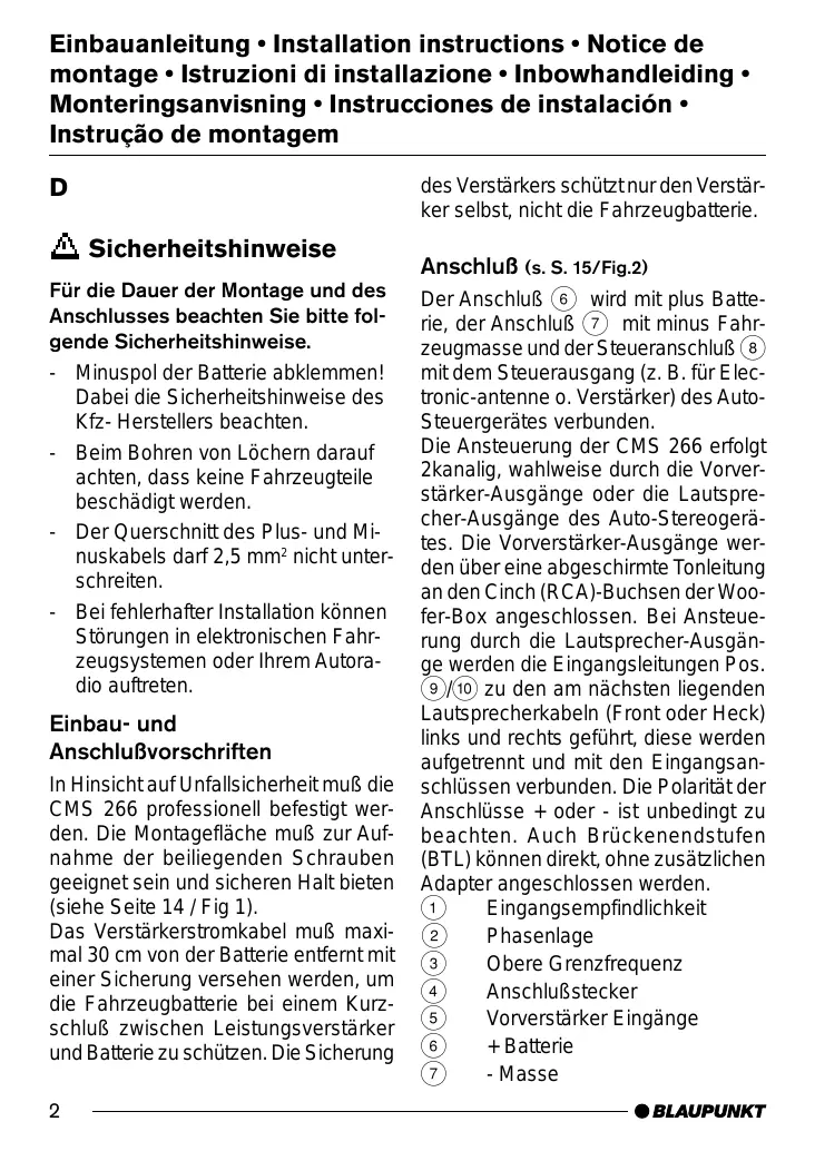 Sicherheitshinweise Für die Dauer der Montage und des Anschlusses beachten Sie bitte folgende Sicherheitshinweise. - Minuspol der Batterie abklemmen! Dabei die Sicherheitshinweise des Kfz- Herstellers beachten. - Beim Bohren von Löchern darauf achten, dass keine Fahrzeugteile beschädigt werden. - Der Querschnitt des Plus- und Minuskabels darf 2,5 mm2 nicht unterschreiten. - Bei fehlerhafter Installation können Störungen in elektronischen Fahrzeugsystemen oder Ihrem Autoradio auftreten. Einbau- und Anschlußvorschriften In Hinsicht auf Unfallsicherheit muß die CMS 266 professionell befestigt werden. Die Montagefläche muß zur Aufnahme der beiliegenden Schrauben geeignet sein und sicheren Halt bieten (siehe Seite 14 / Fig 1). Das Verstärkerstromkabel muß maximal 30 cm von der Batterie entfernt mit einer Sicherung versehen werden, um die Fahrzeugbatterie bei einem Kurzschluß zwischen Leistungsverstärker und Batterie zu schützen. Die Sicherung