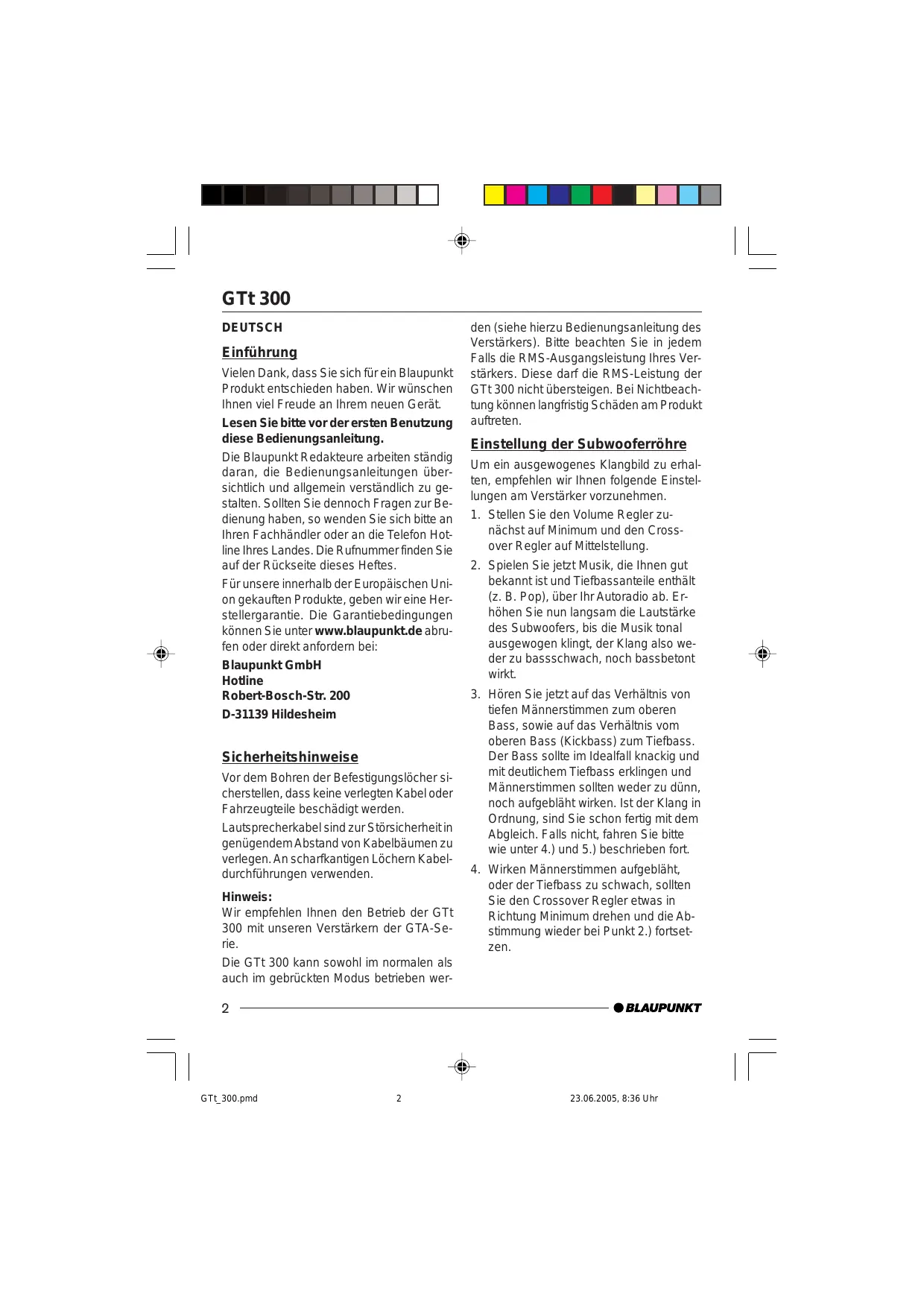 GTt 300 DEUTSCH Einführung Vielen Dank, dass Sie sich für ein Blaupunkt Produkt entschieden haben. Wir wünschen Ihnen viel Freude an Ihrem neuen Gerät. Lesen Sie bitte vor der ersten Benutzung diese Bedienungsanleitung. Die Blaupunkt Redakteure arbeiten ständig daran, die Bedienungsanleitungen übersichtlich und allgemein verständlich zu gestalten. Sollten Sie dennoch Fragen zur Bedienung haben, so wenden Sie sich bitte an Ihren Fachhändler oder an die Telefon Hotline Ihres Landes. Die Rufnummer finden Sie auf der Rückseite dieses Heftes. Für unsere innerhalb der Europäischen Union gekauften Produkte, geben wir eine Herstellergarantie. Die Garantiebedingungen können Sie unter www.blaupunkt.de abrufen oder direkt anfordern bei: Blaupunkt GmbH Hotline Robert-Bosch-Str. 200 D-31139 Hildesheim Sicherheitshinweise Vor dem Bohren der Befestigungslöcher sicherstellen, dass keine verlegten Kabel oder Fahrzeugteile beschädigt werden. Lautsprecherkabel sind zur Störsicherheit in genügendem Abstand von Kabelbäumen zu verlegen. An scharfkantigen Löchern Kabeldurchführungen verwenden. Hinweis: Wir empfehlen Ihnen den Betrieb der GTt 300 mit unseren Verstärkern der GTA-Serie. Die GTt 300 kann sowohl im normalen als auch im gebrückten Modus betrieben wer- den (siehe hierzu Bedienungsanleitung des Verstärkers). Bitte beachten Sie in jedem Falls die RMS-Ausgangsleistung Ihres Verstärkers. Diese darf die RMS-Leistung der GTt 300 nicht übersteigen. Bei Nichtbeachtung können langfristig Schäden am Produkt auftreten. Einstellung der Subwooferröhre Um ein ausgewogenes Klangbild zu erhalten, empfehlen wir Ihnen folgende Einstellungen am Verstärker vorzunehmen.