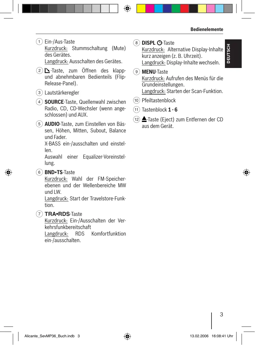 Hinweise und Zubehör 6 Altgerät-Entsorgung (nur EU-Länder)... 6 Einbau 6 Sonderzubehör (nicht im Lieferumfang) 6 Abnehmbares Bedienteil 7 Diebstahlschutz 7 Abnehmen des Bedienteils 8 Bedienteil anbringen 8 Ausschaltzeit (OFF TIMER) 8 Ein-/Ausschalten 9 Lautstärke einstellen 9 Einschaltlautstärke einstellen 9 Lautstärke schnell absenken (Mute).. 10 Telefon-Audio/Navigation-Audio 10 Bestätigungston ein-/ausschalten 11 Automatic Sound 11 Radiobetrieb 12 Tuner einstellen 12 Radiobetrieb einschalten 12 RDS-Komfortfunktion (AF, REG) 12 Wellenbereich/Speicherebene wählen 13 Sender einstellen 13 Empfindlichkeit des Sendersuchlaufs einstellen 14 Sender speichern 14 Sender automatisch speichern (Travelstore) 14 Gespeicherte Sender abrufen 15 Empfangbare Sender anspielen (SCAN) 15 Anspielzeit einstellen 15 Programm-Typ (PTY) 15 Radioempfang optimieren 17 Anzeige einstellen 17
