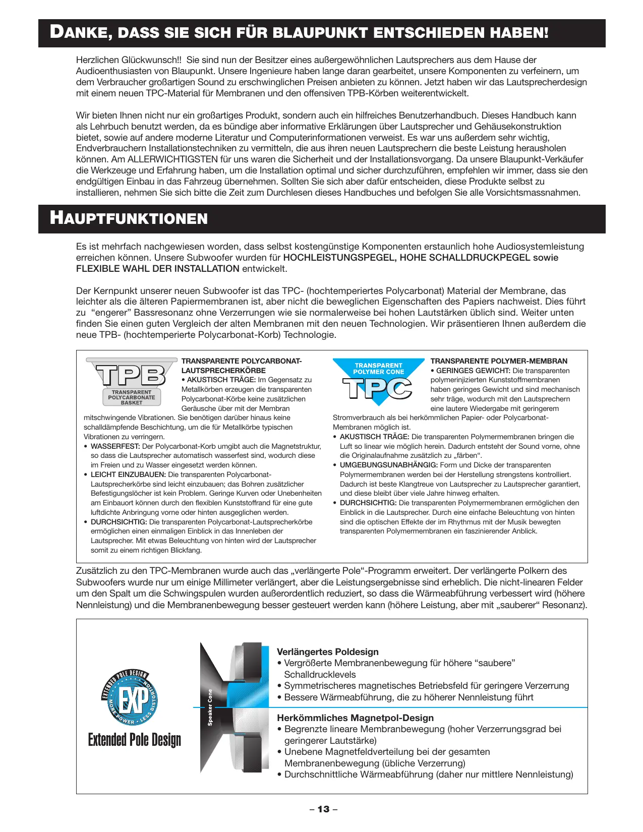 Herzlichen Glückwunsch!! Sie sind nun der Besitzer eines außergewöhnlichen Lautsprechers aus dem Hause der Audioenthusiasten von Blaupunkt. Unsere Ingenieure haben lange daran gearbeitet, unsere Komponenten zu verfeinern, um dem Verbraucher großartigen Sound zu erschwinglichen Preisen anbieten zu konnen.Jetzt haben wir das Lautsprecherdesign mit einem neuen TPC-Material für Membranen und den offensiven TPB-Körben weiterentwickelt.