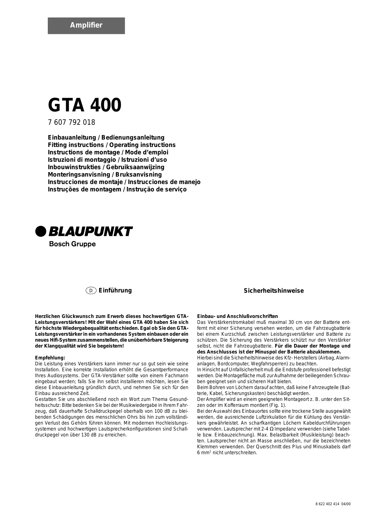 Herzlichen Glückwunsch zum Erwerb dieses hochwertigen GTALeistungsverstärkers! Mit der Wahl eines GTA 400 haben Sie sich für höchste Wiedergabequalität entschieden. Egal ob Sie den GTALeistungsverstärker in ein vorhandenes System einbauen oder ein neues Hifi-System zusammenstellen, die unüberhörbare Steigerung der Klangqualität wird Sie begeistern! Empfehlung: Die Leistung eines Verstärkers kann immer nur so gut sein wie seine Installation. Eine korrekte Installation erhöht die Gesamtperformance Ihres Audiosystems. Der GTA-Verstärker sollte von einem Fachmann eingebaut werden; falls Sie ihn selbst installieren möchten, lesen Sie diese Einbauanleitung gründlich durch, und nehmen Sie sich für den Einbau ausreichend Zeit. Gestatten Sie uns abschließend noch ein Wort zum Thema Gesundheitsschutz: Bitte bedenken Sie bei der Musikwiedergabe in Ihrem Fahrzeug, daß dauerhafte Schalldruckpegel oberhalb von 100 dB zu bleibenden Schädigungen des menschlichen Ohrs bis hin zum vollständigen Verlust des Gehörs führen können. Mit modernen Hochleistungssystemen und hochwertigen Lautsprecherkonfigurationen sind Schalldruckpegel von über 130 dB zu erreichen.