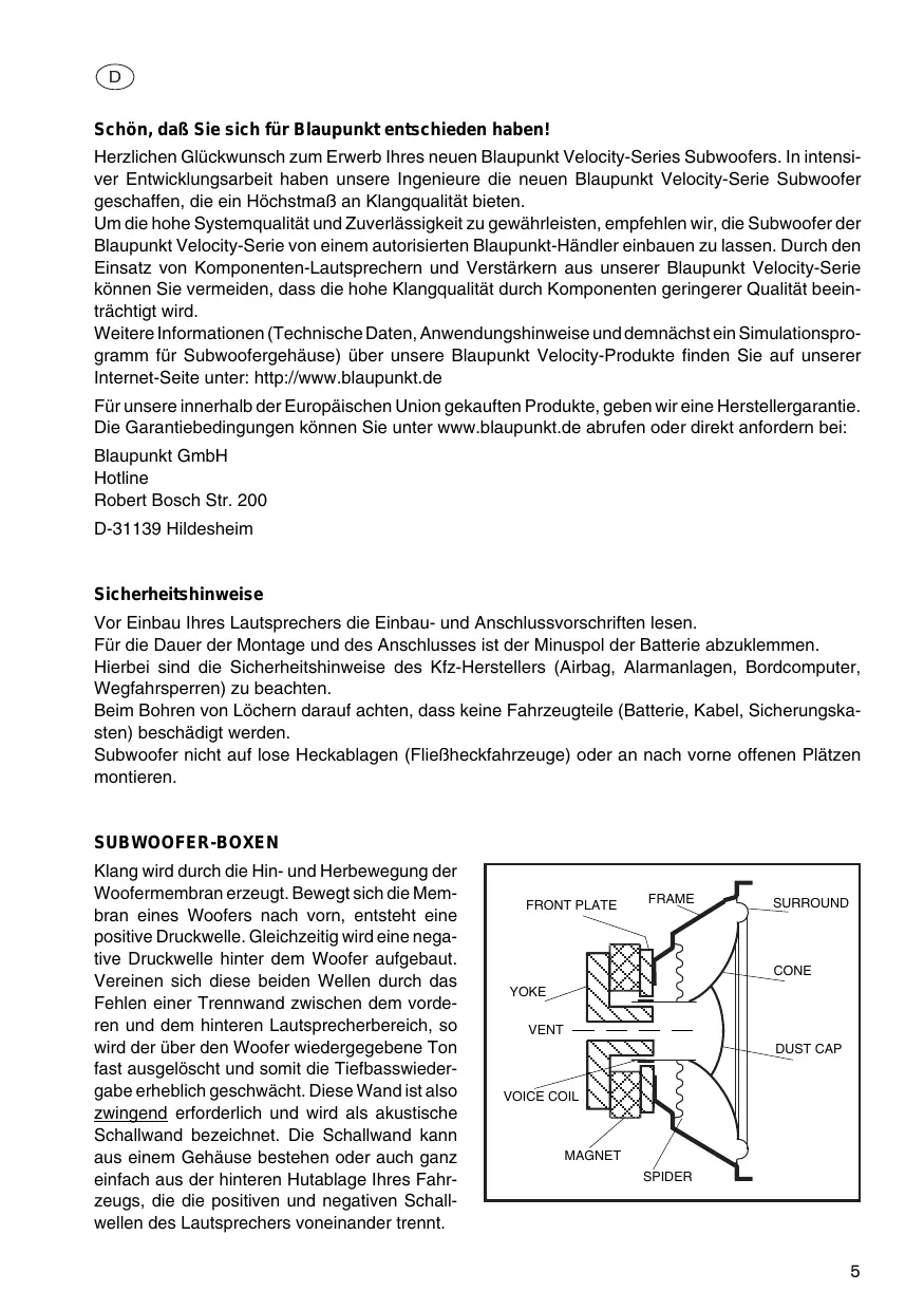 Herzlichen Glückwunsch zum Erwerb Ihr's neuen Blaupunkt Velocity-Series Subwoofer. In intensiver Entwicklungserarbeit haben unsere Ingenieure die neuen Blaupunkt Velocity-Serie Subwoofer geschaffen, die ein Höchstmaß an Klangqualität bieten.
