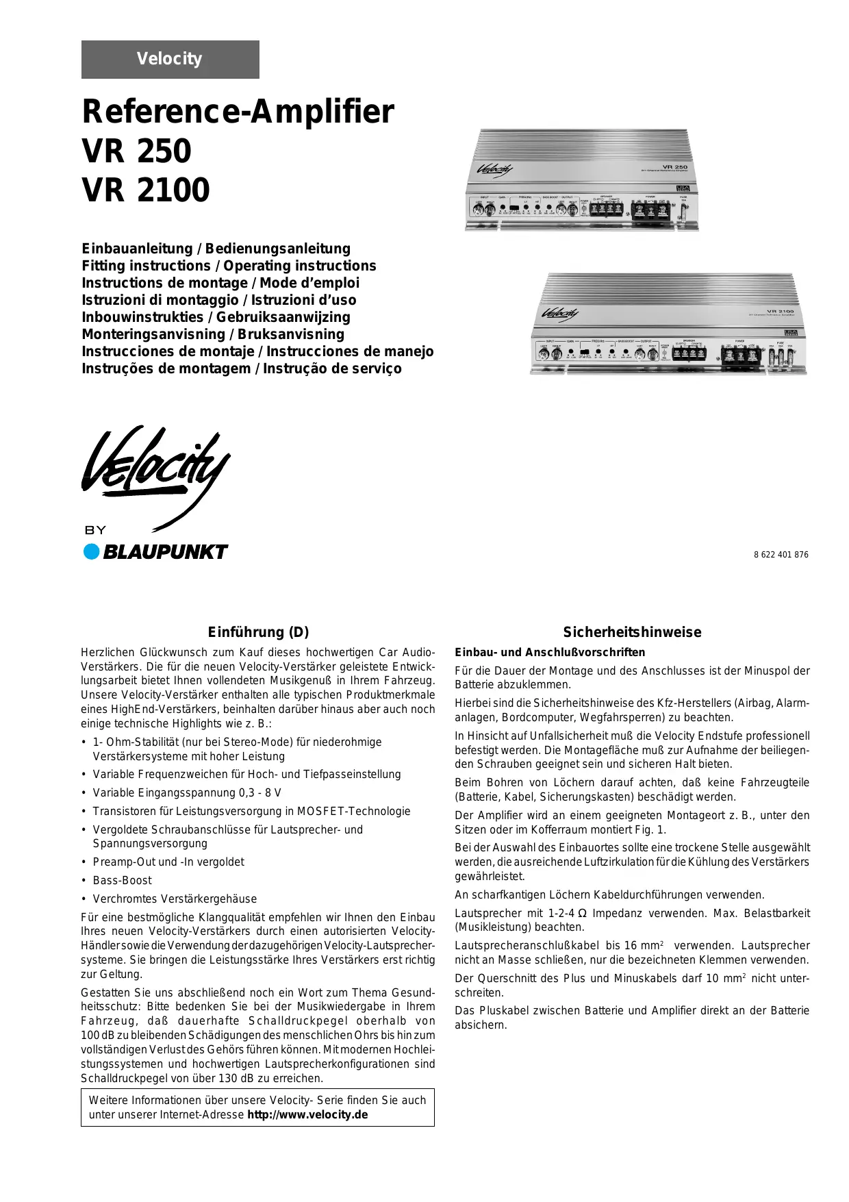 Finden Sie kostenlos die Bedienungsanleitung des Geräts VR 250 VELOCITY AMP BLAUPUNKT als PDF.