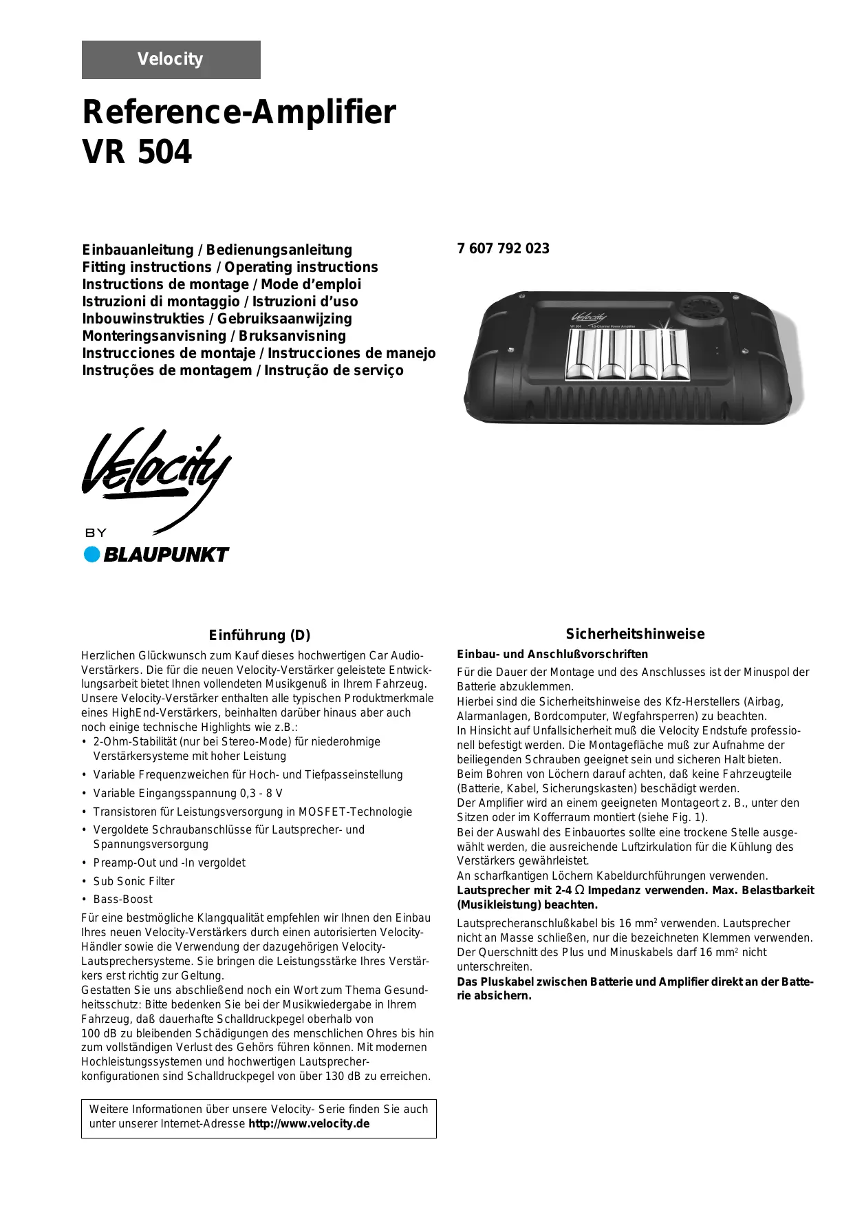 Finden Sie kostenlos die Bedienungsanleitung des Geräts VR 504 VELOCITY AMP BLAUPUNKT als PDF.
