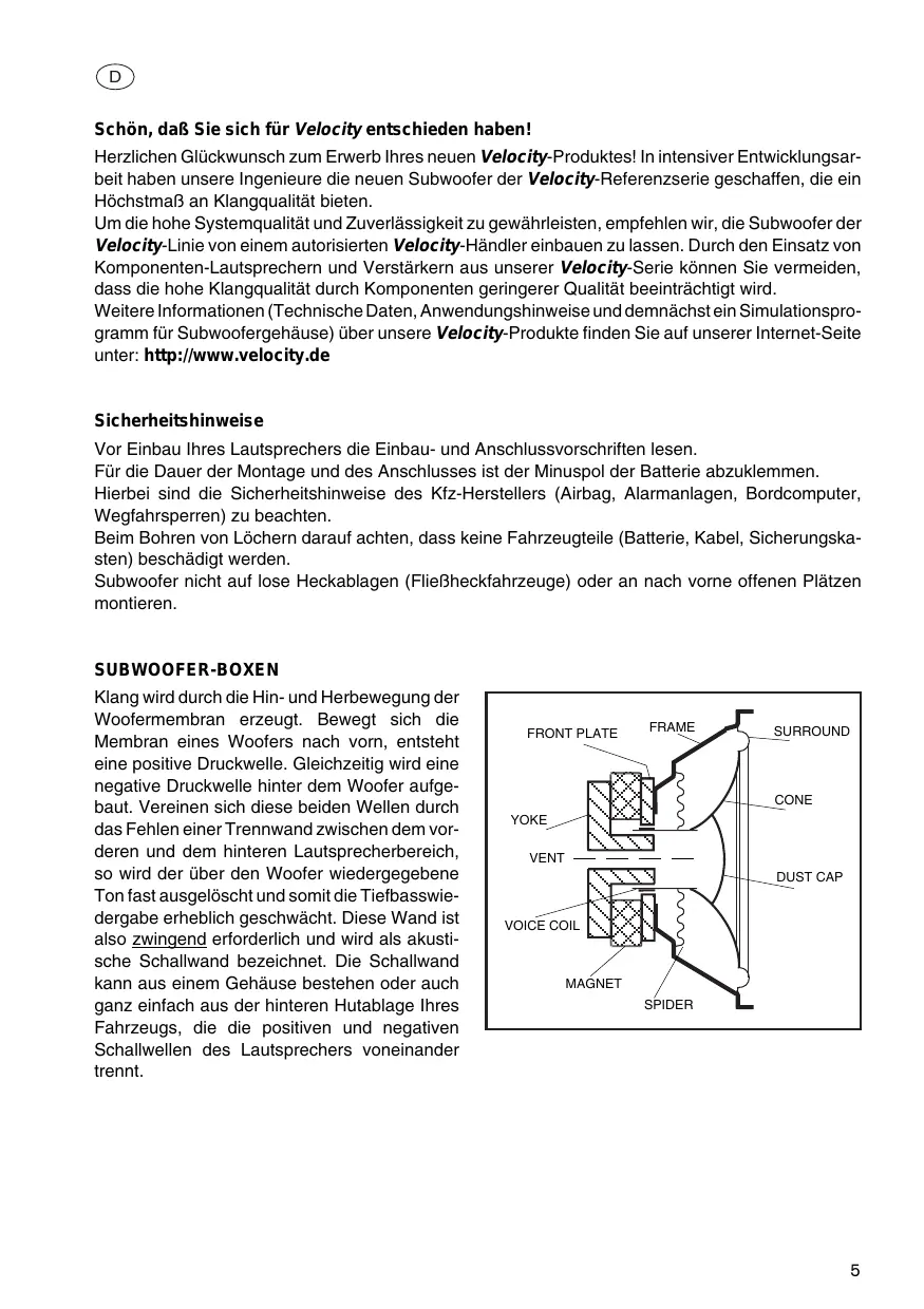 D Schön, daß Sie sich für Velocity entschieden haben! Herzlichen Glückwunsch zum Erwerb Ihres neuen Velocity-Produktes! In intensiver Entwicklungsarbeit haben unsere Ingenieure die neuen Subwoofer der Velocity-Referenzserie geschaffen, die ein Höchstmaß an Klangqualität bieten. Um die hohe Systemqualität und Zuverlässigkeit zu gewährleisten, empfehlen wir, die Subwoofer der Velocity-Linie von einem autorisierten Velocity-Händler einbauen zu lassen. Durch den Einsatz von Komponenten-Lautsprechern und Verstärkern aus unserer Velocity-Serie können Sie vermeiden, dass die hohe Klangqualität durch Komponenten geringerer Qualität beeinträchtigt wird. Weitere Informationen (Technische Daten, Anwendungshinweise und demnächst ein Simulationsprogramm für Subwoofergehäuse) über unsere Velocity-Produkte finden Sie auf unserer Internet-Seite unter: http://www.velocity.de