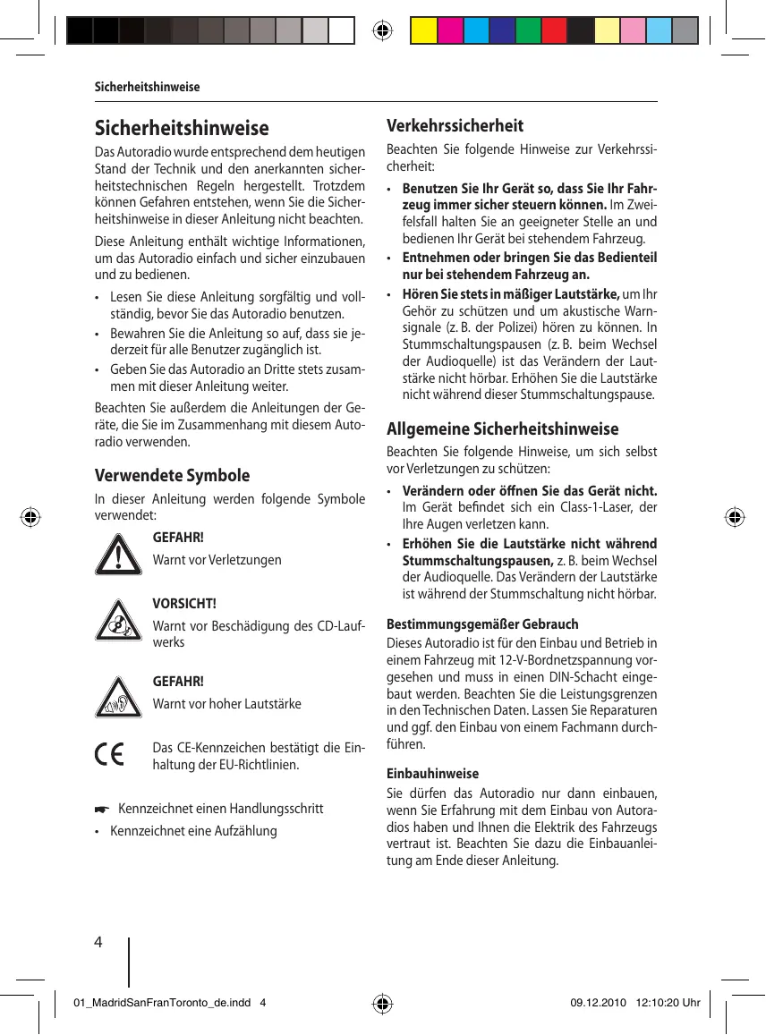 Verwendete Symbole In dieser Anleitung werden folgende Symbole verwendet: GEFAHR! Warnt vor Verletzungen VORSICHT! Warnt vor Beschädigung des CD-Laufwerks GEFAHR! Warnt vor hoher Lautstärke Das CE-Kennzeichen bestätigt die Einhaltung der EU-Richtlinien. 쏅 Kennzeichnet einen Handlungsschritt • Kennzeichnet eine Aufzählung