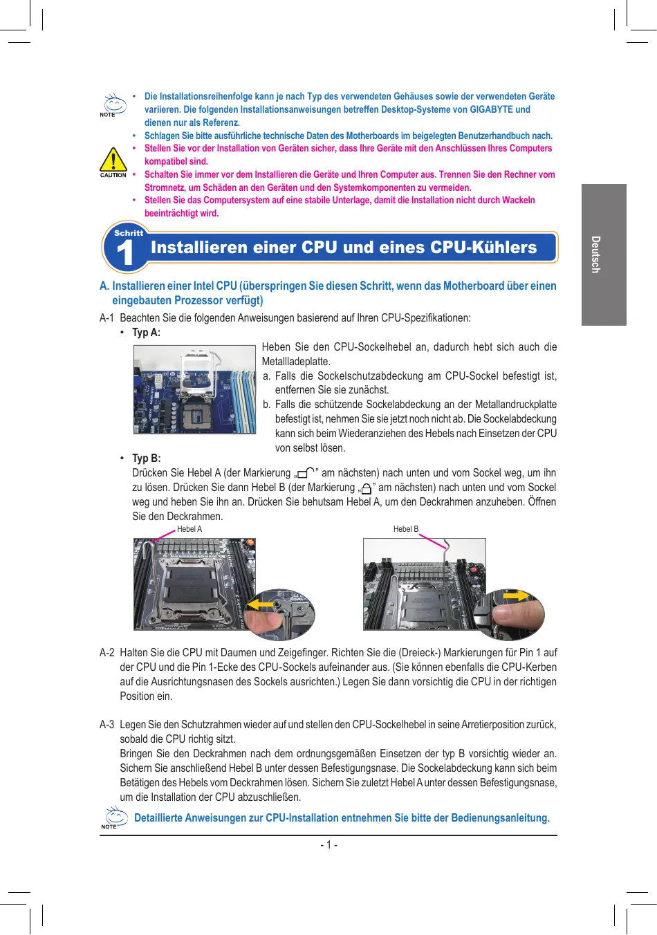 - • Typ B: Drücken Sie Hebel A (der Markierung „ ” am nächsten) nach unten und vom Sockel weg, um ihn zu lösen. Drücken Sie dann Hebel B (der Markierung „ ” am nächsten) nach unten und vom Sockel weg und heben Sie ihn an. Drücken Sie behutsam Hebel A, um den Deckrahmen anzuheben. Öffnen Sie den Deckrahmen. Hebel A Hebel B A-2 Halten Sie die CPU mit Daumen und Zeigefinger. Richten Sie die (Dreieck-) Markierungen für Pin 1 auf der CPU und die Pin 1-Ecke des CPU-Sockels aufeinander aus. (Sie können ebenfalls die CPU-Kerben auf die Ausrichtungsnasen des Sockels ausrichten.) Legen Sie dann vorsichtig die CPU in der richtigen Position ein. A-3 Legen Sie den Schutzrahmen wieder auf und stellen den CPU-Sockelhebel in seine Arretierposition zurück, sobald die CPU richtig sitzt. Bringen Sie den Deckrahmen nach dem ordnungsgemäßen Einsetzen der typ B vorsichtig wieder an. Sichern Sie anschließend Hebel B unter dessen Befestigungsnase. Die Sockelabdeckung kann sich beim Betätigen des Hebels vom Deckrahmen lösen. Sichern Sie zuletzt Hebel A unter dessen Befestigungsnase, um die Installation der CPU abzuschließen. Detaillierte Anweisungen zur CPU-Installation entnehmen Sie bitte der Bedienungsanleitung.
