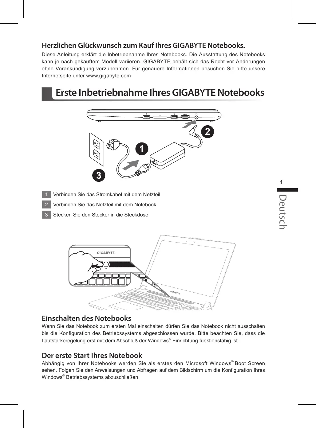 Herzlichen Glückwunsch zum Kauf Ihres GIGABYTE Notebooks. Diese Anleitung erklärt die Inbetriebnahme Ihres Notebooks. Die Ausstattung des Notebooks kann je nach gekauftem Modell variieren. GIGABYTE behält sich das Recht vor Änderungen ohne Vorankündigung vorzunehmen. Für genauere Informationen besuchen Sie bitte unsere Internetseite unter www.gigabyte.com