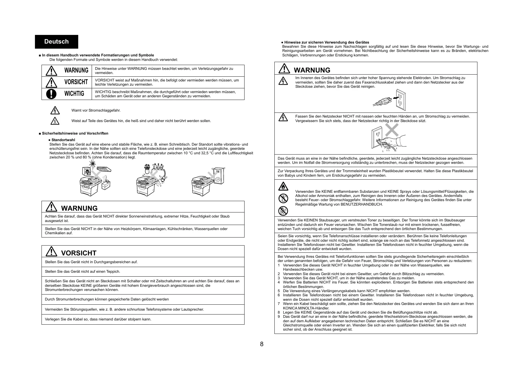 Deutsch ● Hinweise zur sicheren Verwendung des Gerätes Bewahren Sie diese Hinweise zum Nachschlagen sorgfältig auf und lesen Sie diese Hinweise, bevor Sie Wartungs- und Reinigungsarbeiten am Gerät vornehmen. Bei Nichtbeachtung der Sicherheitshinweise kann es zu Bränden, elektrischen Schlägen, Verbrennungen oder Erstickung kommen. ■ In diesem Handbuch verwendete Formatierungen und Symbole Die folgenden Formate und Symbole werden in diesem Handbuch verwendet: WARNUNG Die Hinweise unter WARNUNG müssen beachtet werden, um Verletzungsgefahr zu vermeiden. VORSICHT VORSICHT weist auf Maßnahmen hin, die befolgt oder vermieden werden müssen, um leichte Verletzungen zu vermeiden. WICHTIG WICHTIG beschreibt Maßnahmen, die durchgeführt oder vermieden werden müssen, um Schäden am Gerät oder an anderen Gegenständen zu vermeiden. WARNUNG Im Inneren des Gerätes befinden sich unter hoher Spannung stehende Elektroden. Um Stromschlag zu vermeiden, sollten Sie daher zuerst das Faxanschlusskabel ziehen und dann den Netzstecker aus der Steckdose ziehen, bevor Sie das Gerät reinigen. Warnt vor Stromschlaggefahr. Fassen Sie den Netzstecker NICHT mit nassen oder feuchten Händen an, um Stromschlag zu vermeiden. Vergewissern Sie sich stets, dass der Netzstecker richtig in der Steckdose sitzt. Weist auf Teile des Gerätes hin, die heiß sind und daher nicht berührt werden sollen. ■ Sicherheitshinweise und Vorschriften ● Standortwahl Stellen Sie das Gerät auf eine ebene und stabile Fläche, wie z. B. einen Schreibtisch. Der Standort sollte vibrations- und erschütterungsfrei sein. In der Nähe sollten sich eine Telefonsteckdose und eine jederzeit leicht zugängliche, geerdete Netzsteckdose befinden. Achten Sie darauf, dass die Raumtemperatur zwischen 10 °C und 32,5 °C und die Luftfeuchtigkeit zwischen 20 % und 80 % (ohne Kondensation) liegt. Das Gerät muss an eine in der Nähe befindliche, geerdete, jederzeit leicht zugängliche Netzsteckdose angeschlossen werden. Um im Notfall die Stromversorgung vollständig zu unterbrechen, muss der Netzstecker gezogen werden. Zur Verpackung Ihres Gerätes und der Trommeleinheit wurden Plastikbeutel verwendet. Halten Sie diese Plastikbeutel von Babys und Kindern fern, um Erstickungsgefahr zu vermeiden. Verwenden Sie KEINE entflammbaren Substanzen und KEINE Sprays oder Lösungsmittel/Flüssigkeiten, die Alkohol oder Ammoniak enthalten, zum Reinigen des Inneren oder Äußeren des Gerätes. Andernfalls besteht Feuer- oder Stromschlaggefahr. Weitere Informationen zur Reinigung des Gerätes finden Sie unter Regelmäßige Wartung von BENUTZERHANDBUCH. WARNUNG Achten Sie darauf, dass das Gerät NICHT direkter Sonneneinstrahlung, extremer Hitze, Feuchtigkeit oder Staub ausgesetzt ist. Verwenden Sie KEINEN Staubsauger, um verstreuten Toner zu beseitigen. Der Toner könnte sich im Staubsauger entzünden und dadurch ein Feuer verursachen. Wischen Sie Tonerstaub nur mit einem trockenen, fusselfreien, weichen Tuch vorsichtig ab und entsorgen Sie das Tuch entsprechend den örtlichen Bestimmungen. Stellen Sie das Gerät NICHT in der Nähe von Heizkörpern, Klimaanlagen, Kühlschränken, Wasserquellen oder Chemikalien auf. Seien Sie vorsichtig, wenn Sie Telefonanschlüsse installieren oder verändern. Berühren Sie keine Telefonleitungen oder Endgeräte, die nicht oder nicht richtig isoliert sind, solange sie noch an das Telefonnetz angeschlossen sind. Installieren Sie Telefondosen nicht bei Gewitter. Installieren Sie Telefondosen nicht in feuchter Umgebung, wenn die Dosen nicht speziell dafür entwickelt wurden. VORSICHT Bei Verwendung Ihres Gerätes mit Telefonfunktionen sollten Sie stets grundlegende Sicherheitsregeln einschließlich der unten genannten befolgen, um die Gefahr von Feuer, Stromschlag und Verletzungen von Personen zu reduzieren: 1 Verwenden Sie dieses Gerät NICHT in feuchter Umgebung oder in der Nähe von Wasserquellen, wie Handwaschbecken usw. 2 Verwenden Sie dieses Gerät nicht bei einem Gewitter, um Gefahr durch Blitzschlag zu vermeiden. 3 Verwenden Sie das Gerät NICHT, um in der Nähe austretendes Gas zu melden. 4 Werfen Sie Batterien NICHT ins Feuer. Sie könnten explodieren. Entsorgen Sie Batterien stets entsprechend den örtlichen Bestimmungen. 5 Die Verwendung eines Verlängerungskabels kann NICHT empfohlen werden. 6 Installieren Sie Telefondosen nicht bei einem Gewitter. Installieren Sie Telefondosen nicht in feuchter Umgebung, wenn die Dosen nicht speziell dafür entwickelt wurden. 7 Wenn ein Kabel beschädigt sein sollte, ziehen Sie den Netzstecker des Gerätes und wenden Sie sich dann an Ihren KONICA MINOLTA-Händler. 8 Legen Sie KEINE Gegenstände auf das Gerät und decken Sie die Belüftungsschlitze nicht ab. 9 Das Gerät darf nur an eine in der Nähe befindliche, geerdete Wechselstrom-Steckdose angeschlossen werden, die den auf dem Aufkleber angegebenen technischen Daten entspricht. Schließen Sie es NICHT an eine Gleichstromquelle oder einen Inverter an. Wenden Sie sich an einen qualifizierten Elektriker, falls Sie sich nicht sicher sind, ob der Anschluss geeignet ist. Stellen Sie das Gerät nicht in Durchgangsbereichen auf. Stellen Sie das Gerät nicht auf einen Teppich. Schließen Sie das Gerät nicht an Steckdosen mit Schalter oder mit Zeitschaltuhren an und achten Sie darauf, dass an derselben Steckdose KEINE größeren Geräte mit hohem Energieverbrauch angeschlossen sind, die Stromunterbrechungen verursachen können. Durch Stromunterbrechungen können gespeicherte Daten gelöscht werden Vermeiden Sie Störungsquellen, wie z. B. andere schnurlose Telefonsysteme oder Lautsprecher. Verlegen Sie die Kabel so, dass niemand darüber stolpern kann.
