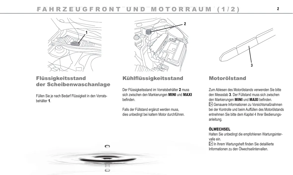 Niveau liquide lave-vitre Flüssigkeitsstand der Scheibenwaschanlage Ajoutez du liquide dans le bocal 1 selon les besoins. Füllen Sie je nach Bedarf Flüssigkeit in den Vorrats behälter 1. Niveau liquide de Kühlflüssigkeitsstand Niveau huile moteur Motorölstand Der Flüssigkeitsstand im Vorratsbehälter 2 muss Le niveau indiqué sur le bocal 2 doit se trouver sich zwischen den Markierungen MINI und MAXI entre le MINI et le MAXI. befinden. Pour consulter le niveau d’huile, utilisez la jauge 3. Zum Ablesen des Motorölstands verwenden Sie bitte Le niveau indiqué sur la jauge doit se trouver entre den Messstab 3. Der Füllstand muss sich zwischen le MINI et le MAXI. den MAXI4befinden. $Markierungen Reportez-vousMINI au und chapitre de votre notice Genauere pour Informationen Vorsichtsmaßnahmen d’utilisation connaîtrezules précautions à prenbei der Kontrolle und beim Auffüllen des dre lors de la lecture du niveau à laMotorölstands jauge et du entne hmen Sied’huile. bitte dem Kapitel 4 Ihrer Bedienungs remplissage anleitung. VIDANGE MOTEUR Respectez impérativement la périodicité des réviÖLWECHSEL sions. Sie unbedingt die empfohlenen Wartungsinter Halten $Reportez-vous au carnet d’entretien de votre valle ein. véhicule connaîtrefinden les intervalles de vidanIn Ihrempour Wartungsheft Sie detaillierte ges. Informationen zu den Ölwechselintervallen. refroidissement S’il est nécessaire de compléter ce niveau, faites-le Falls der Füllstandmoteur ergänztfroid. werden muss, impérativement dies unbedingt bei kaltem Motor durchführen.
