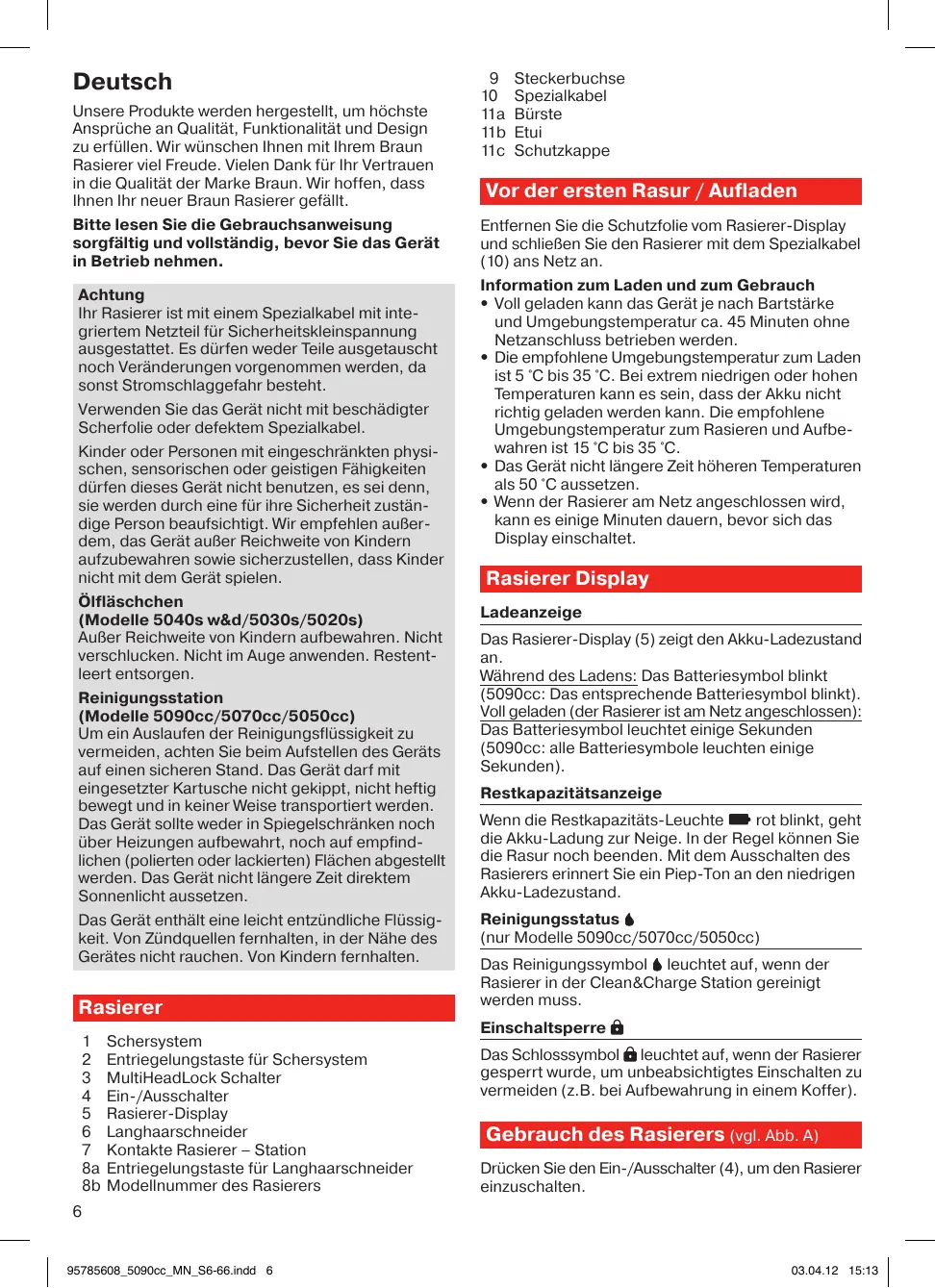 Deutsch Unsere Produkte werden hergestellt, um höchste Ansprüche an Qualität, Funktionalität und Design zu erfüllen. Wir wünschen Ihnen mit Ihrem Braun Rasierer viel Freude. Vielen Dank für Ihr Vertrauen in die Qualität der Marke Braun. Wir hoffen, dass Ihnen Ihr neuer Braun Rasierer gefällt. Bitte lesen Sie die Gebrauchsanweisung sorgfältig und vollständig, bevor Sie das Gerät in Betrieb nehmen. Achtung Ihr Rasierer ist mit einem Spezialkabel mit integriertem Netzteil für Sicherheitskleinspannung ausgestattet. Es dürfen weder Teile ausgetauscht noch Veränderungen vorgenommen werden, da sonst Stromschlaggefahr besteht. Verwenden Sie das Gerät nicht mit beschädigter Scherfolie oder defektem Spezialkabel. Kinder oder Personen mit eingeschränkten physischen, sensorischen oder geistigen Fähigkeiten dürfen dieses Gerät nicht benutzen, es sei denn, sie werden durch eine für ihre Sicherheit zuständige Person beaufsichtigt. Wir empfehlen außerdem, das Gerät außer Reichweite von Kindern aufzubewahren sowie sicherzustellen, dass Kinder nicht mit dem Gerät spielen. Ölfläschchen (Modelle 5040s w&d/5030s/5020s) Außer Reichweite von Kindern aufbewahren. Nicht verschlucken. Nicht im Auge anwenden. Restentleert entsorgen. Reinigungsstation (Modelle 5090cc/5070cc/5050cc) Um ein Auslaufen der Reinigungsflüssigkeit zu vermeiden, achten Sie beim Aufstellen des Geräts auf einen sicheren Stand. Das Gerät darf mit eingesetzter Kartusche nicht gekippt, nicht heftig bewegt und in keiner Weise transportiert werden. Das Gerät sollte weder in Spiegelschränken noch über Heizungen aufbewahrt, noch auf empfindlichen (polierten oder lackierten) Flächen abgestellt werden. Das Gerät nicht längere Zeit direktem Sonnenlicht aussetzen. Das Gerät enthält eine leicht entzündliche Flüssigkeit. Von Zündquellen fernhalten, in der Nähe des Gerätes nicht rauchen. Von Kindern fernhalten. Rasierer