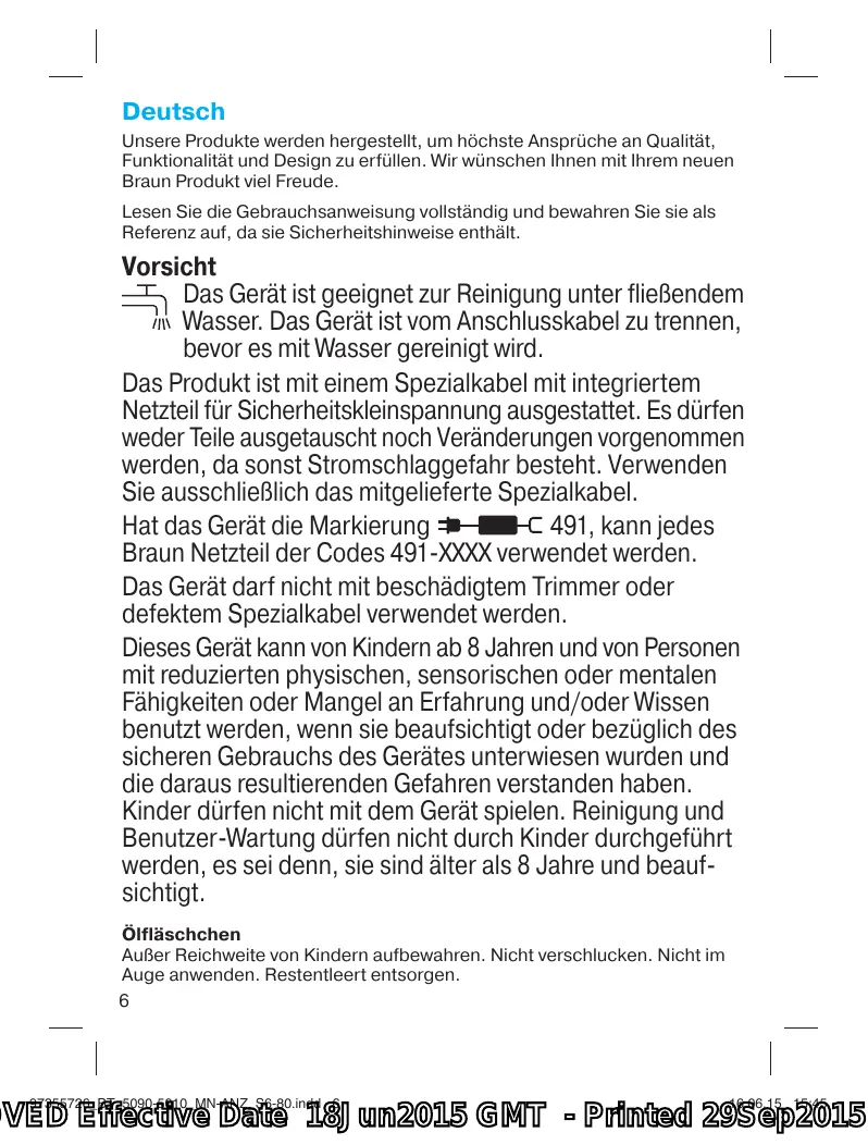 OVED Effective Date 18Jun2015 GMT - Printed 29Sep2015 Deutsch Unsere Produkte werden hergestellt, um höchste Ansprüche an Qualität, Funktionalität und Design zu erfüllen. Wir wünschen Ihnen mit Ihrem neuen Braun Produkt viel Freude. Lesen Sie die Gebrauchsanweisung vollständig und bewahren Sie sie als Referenz auf, da sie Sicherheitshinweise enthält. Vorsicht Das Gerät ist geeignet zur Reinigung unter fließendem Wasser. Das Gerät ist vom Anschlusskabel zu trennen, bevor es mit Wasser gereinigt wird. Das Produkt ist mit einem Spezialkabel mit integriertem Netzteil für Sicherheitskleinspannung ausgestattet. Es dürfen weder Teile ausgetauscht noch Veränderungen vorgenommen werden, da sonst Stromschlaggefahr besteht. Verwenden Sie ausschließlich das mitgelieferte Spezialkabel. Hat das Gerät die Markierung 491, kann jedes Braun Netzteil der Codes 491-XXXX verwendet werden. Das Gerät darf nicht mit beschädigtem Trimmer oder defektem Spezialkabel verwendet werden. Dieses Gerät kann von Kindern ab 8 Jahren und von Personen mit reduzierten physischen, sensorischen oder mentalen Fähigkeiten oder Mangel an Erfahrung und/oder Wissen benutzt werden, wenn sie beaufsichtigt oder bezüglich des sicheren Gebrauchs des Gerätes unterwiesen wurden und die daraus resultierenden Gefahren verstanden haben. Kinder dürfen nicht mit dem Gerät spielen. Reinigung und Benutzer-Wartung dürfen nicht durch Kinder durchgeführt werden, es sei denn, sie sind älter als 8 Jahre und beaufsichtigt. Ölfläschchen Außer Reichweite von Kindern aufbewahren. Nicht verschlucken. Nicht im Auge anwenden. Restentleert entsorgen.