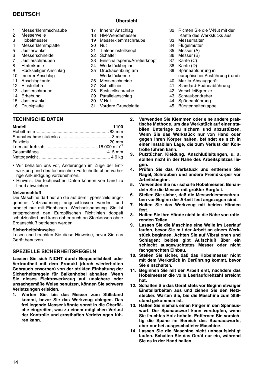 TECHNISCHE DATEN Modell 1100 Hobelbreite 82 mm Spanabnahme stufenlos 3 mm Falztiefe 20 mm Leerlaufdrehzahl 16 000 min-1 Gesamtlänge 415 mm Nettogewicht 4,9 kg • Wir behalten uns vor, Änderungen im Zuge der Entwicklung und des technischen Fortschritts ohne vorherige Ankündigung vorzunehmen. • Hinweis: Die technischen Daten können von Land zu Land abweichen. Netzanschluß Die Maschine darf nur an die auf dem Typenschild angegebene Netzspannung angeschlossen werden und arbeitet nur mit Einphasen- Wechselspannung. Sie ist entsprechend den Europäischen Richtlinien doppelt schutzisoliert und kann daher auch an Steckdosen ohne Erdanschluß betrieben werden.