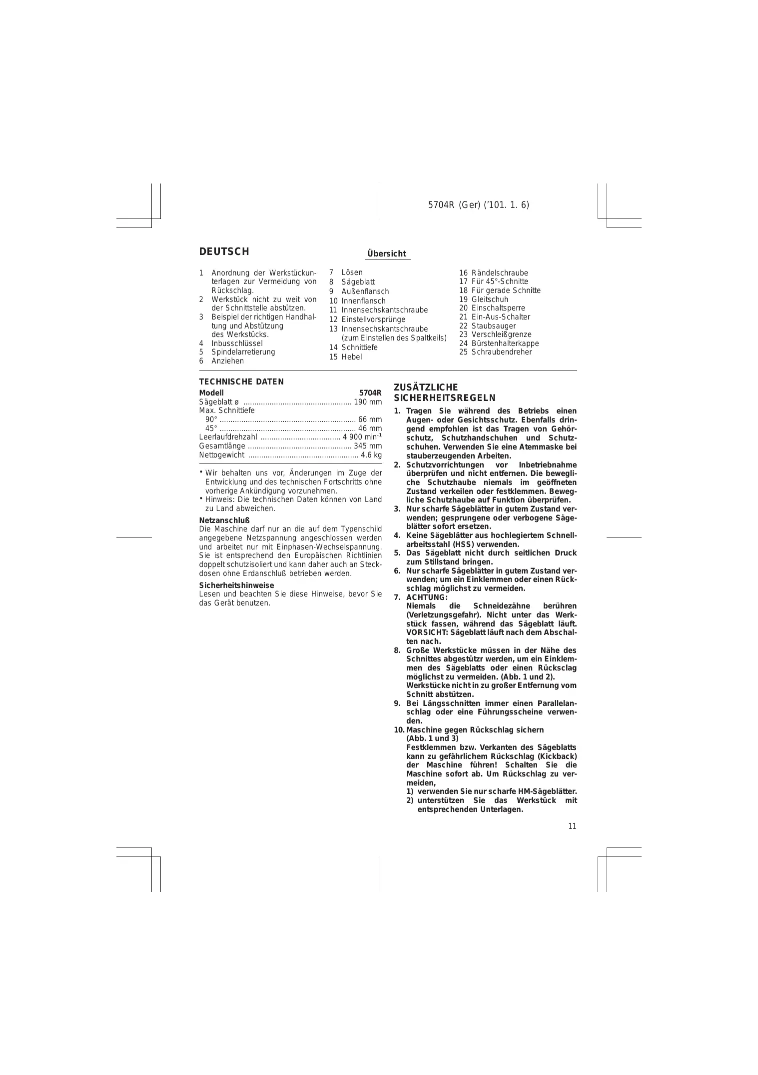 5704R (Ger) (101. 1. 6) BEDIENUNGSHINWEISE Montage und Demontage des Sägeblatts S ägeblätter der folgenden Abmessungen kônnen mit dieser Maschine verwendet werden Loch. | Säge- | pure. ourehm | Sur. | bete | SOU : : | messer | dicke weniger | mehr 190 mm | 170 mm | 29,987 | als 1,7 | als 1.9 mm | mm Die Dicke des Spaltkeils beträgt 1,8 mm VORSICHT: