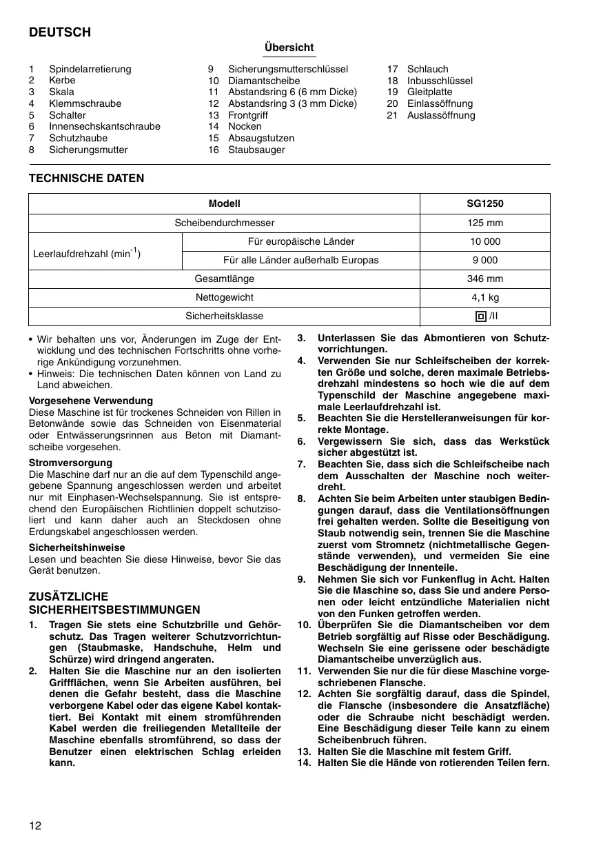 TECHNISCHE DATEN Modell SG1250 Scheibendurchmesser 125 mm ; Für europäische Länder 10 000 Leerlaufdrehzahl (min ) Für alle Länder auBerhalb Europas 9 000 Gesamtlänge 346 mm Nettogewicht 41kg Sicherheitsklasse CI + Wir behalten uns vor, Anderungen im Zuge der Ent- 3. Unterlassen Sie das Abmontieren von Schutz- wicklung und des technischen Fortschritts ohne vorhe- vorrichtungen. rige Ankündigung vorzunehmen. 4. Verwenden Sie nur Schleifscheiben der korrek- + Hinweis: Die technischen Daten kônnen von Land zu ten GrôBe und solche, deren maximale Betriebs- Land abweichen. drehzahl mindestens so hoch wie die auf dem veresshene Varndung Dpecnie d Masenne angageine max