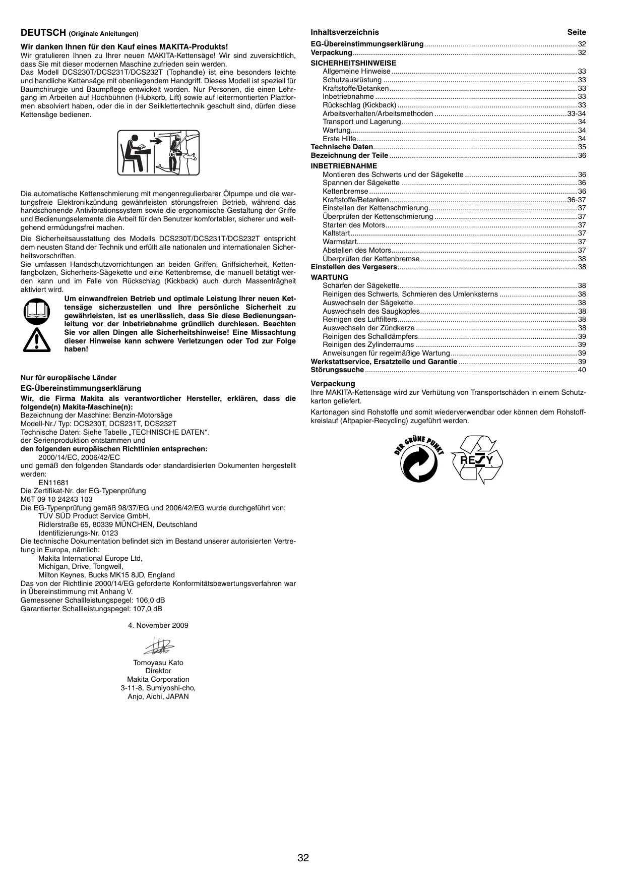 - Störungssuche Wir gratulieren Ihnen zu Ihrer neuen MAKITA-Kettensäge! Wir sind zuversichtlich, dass Sie mit dieser modernen Maschine zufrieden sein werden. Das Modell DCS230T/DCS231T/DCS232T (Tophandle) ist eine besonders leichte und handliche Kettensäge mit obenliegendem Handgriff. Dieses Modell ist speziell für Baumchirurgie und Baumpflege entwickelt worden. Nur Personen, die einen Lehrgang im Arbeiten auf Hochbühnen (Hubkorb, Lift) sowie auf leitermontierten Plattformen absolviert haben, oder die in der Seilklettertechnik geschult sind, dürfen diese Kettensäge bedienen. Die automatische Kettenschmierung mit mengenregulierbarer Ölpumpe und die wartungsfreie Elektronikzündung gewährleisten störungsfreien Betrieb, während das handschonende Antivibrationssystem sowie die ergonomische Gestaltung der Griffe und Bedienungselemente die Arbeit für den Benutzer komfortabler, sicherer und weitgehend ermüdungsfrei machen. Die Sicherheitsausstattung des Modells DCS230T/DCS231T/DCS232T entspricht dem neusten Stand der Technik und erfüllt alle nationalen und internationalen Sicherheitsvorschriften. Sie umfassen Handschutzvorrichtungen an beiden Griffen, Griffsicherheit, Kettenfangbolzen, Sicherheits-Sägekette und eine Kettenbremse, die manuell betätigt werden kann und im Falle von Rückschlag (Kickback) auch durch Massenträgheit aktiviert wird. Um einwandfreien Betrieb und optimale Leistung Ihrer neuen Kettensäge sicherzustellen und Ihre persönliche Sicherheit zu gewährleisten, ist es unerlässlich, dass Sie diese Bedienungsanleitung vor der Inbetriebnahme gründlich durchlesen. Beachten Sie vor allen Dingen alle Sicherheitshinweise! Eine Missachtung dieser Hinweise kann schwere Verletzungen oder Tod zur Folge haben! Nur für europäische Länder Seite Verpackung EG-Übereinstimmungserklärung Ihre MAKITA-Kettensäge wird zur Verhütung von Transportschäden in einem Schutzkarton geliefert. Wir, die Firma Makita als verantwortlicher Hersteller, erklären, dass die folgende(n) Makita-Maschine(n): Bezeichnung der Maschine: Benzin-Motorsäge Modell-Nr./ Typ: DCS230T, DCS231T, DCS232T Technische Daten: Siehe Tabelle „TECHNISCHE DATEN“. der Serienproduktion entstammen und den folgenden europäischen Richtlinien entsprechen: 2000/14/EC, 2006/42/EC und gemäß den folgenden Standards oder standardisierten Dokumenten hergestellt werden: EN11681 Die Zertifikat-Nr. der EG-Typenprüfung M6T 09 10 24243 103 Die EG-Typenprüfung gemäß 98/37/EG und 2006/42/EG wurde durchgeführt von: TÜV SÜD Product Service GmbH, Ridlerstraße 65, 80339 MÜNCHEN, Deutschland Identifizierungs-Nr. 0123 Die technische Dokumentation befindet sich im Bestand unserer autorisierten Vertretung in Europa, nämlich: Makita International Europe Ltd, Michigan, Drive, Tongwell, Milton Keynes, Bucks MK15 8JD, England Das von der Richtlinie 2000/14/EG geforderte Konformitätsbewertungsverfahren war in Übereinstimmung mit Anhang V. Gemessener Schallleistungspegel: 106,0 dB Garantierter Schallleistungspegel: 107,0 dB Kartonagen sind Rohstoffe und somit wiederverwendbar oder können dem Rohstoffkreislauf (Altpapier-Recycling) zugeführt werden. RE Y p. 40