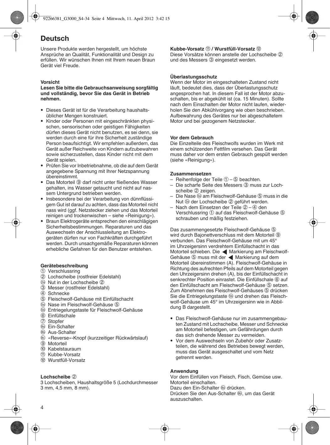 - Braun Elektrogeräte entsprechen den einschlägigen Sicherheitsbestimmungen. Reparaturen und das Auswechseln der Anschlussleitung an Elektrogeräten dürfen nur von Fachkräften durchgeführt werden. Durch unsachgemäße Reparaturen können erhebliche Gefahren für den Benutzer entstehen. Gerätebeschreibung 1 Verschlussring 2 Lochscheibe (rostfreier Edelstahl) B Nut in der Lochscheibe 2 3 Messer (rostfreier Edelstahl) 4 Schnecke 5 Fleischwolf-Gehäuse mit Einfüllschacht E Nase im Fleischwolf-Gehäuse 5 e Entriegelungstaste für Fleischwolf-Gehäuse 6 Einfüllschale 7 Stopfer H Ein-Schalter h Aus-Schalter ∞ «Reverse»-Knopf (kurzzeitiger Rückwärtslauf) 9 Motorteil j Kabelstauraum 11 Kubbe-Vorsatz l Wurstfüll-Vorsatz Lochscheibe 2 3 Lochscheiben, Haushaltsgröße 5 (Lochdurchmesser 3 mm, 4,5 mm, 8 mm).