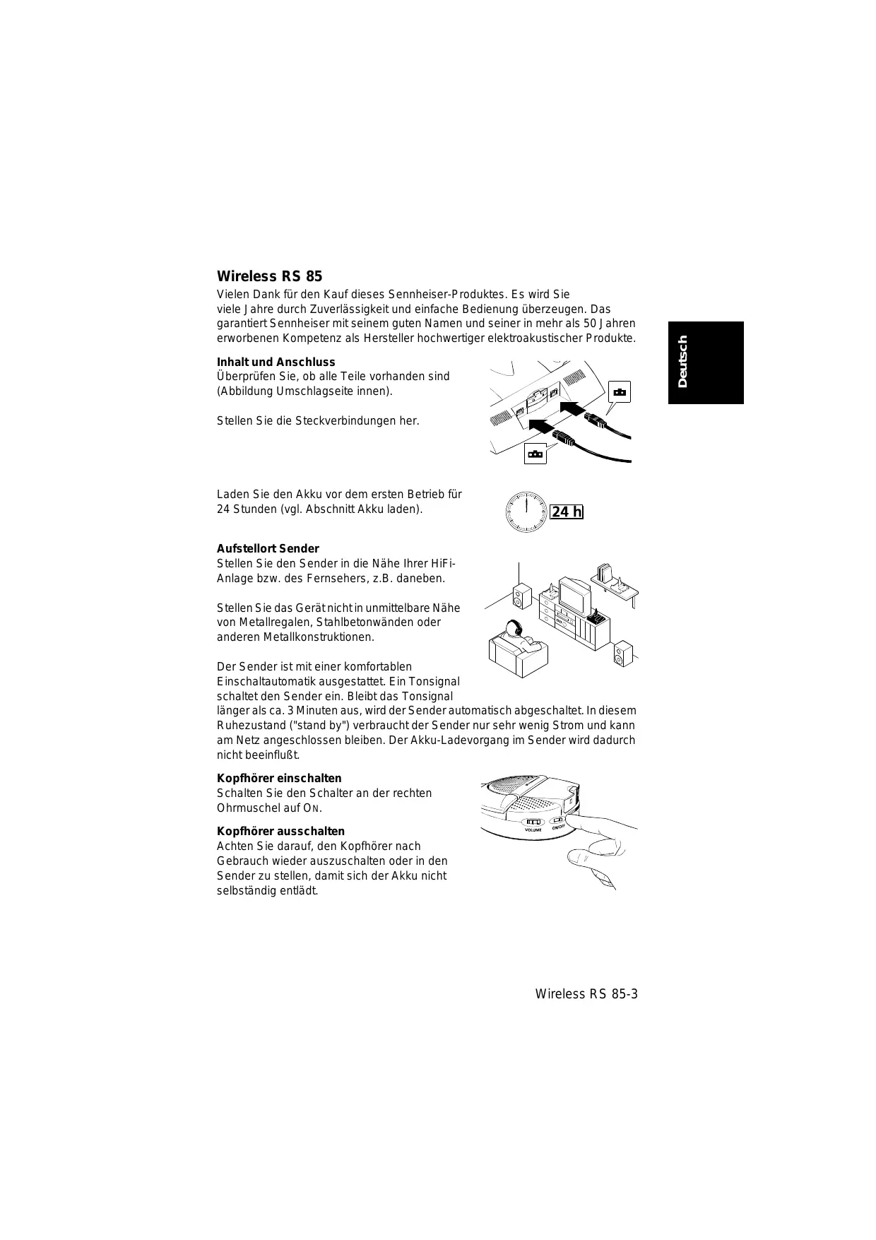 Wireless RS 85 Vielen Dank für den Kauf dieses Sennheiser-P roduktes. Es wird Sie viele J ahre durch Zuverlässigkeit und einfache Bedienung überzeugen. Das garantiert Sennheiser mit seinem guten Namen und seiner in mehr als 50 J ahren erworbenen Kompetenz als Hersteller hochwertiger elektroakustischer P rodukte. Inhalt und Anschluss Überprüfen Sie, ob alle Teile vorhanden sind {Abbildung Umschlagseite innen). Stellen Sie die Steckverbindungen her. Laden Sie den Akku vor dem ersten Betrieb für 24 Stunden (vgl. Abschnitt Akku laden). Aufstellort Sender Stellen Sie den Sender in die Nähe lhrer HiFi- Anlage bzw. des Fernsehers, z.B. daneben. Stellen Sie das Gerätnichtin unmittelbare Nähe von Metallregalen, Stahlbetonwänden oder anderen Metallkonstruktionen. Der Sender ist mit einer komfortablen Einschaltautomatik ausgestattet. Ein Tonsignal schaltet den Sender ein. Bleibt das Tonsignal lénger als ca. 3 Minuten aus, wird der Sender automatisch abgeschaltet. In diesem Ruhezustand ("stand by") verbraucht der Sender nur sehr wenig Strom und kann am Netz angeschlossen bleiben, Der Akku-Ladevorgang im Sender wird dadurch nicht beeinfluBt Kopfhôrer einschalten Schaiten Sie den Schalter an der rechten Ohrmuschel auf ON. Kopfhèrer ausschalten Achten Sie darauf, den Kopfhôrer nach Gebrauch wieder auszuschalten oder in den Sender zu stellen, damit sich der Akku nicht selbständig entiädt. Wireless RS 85-3