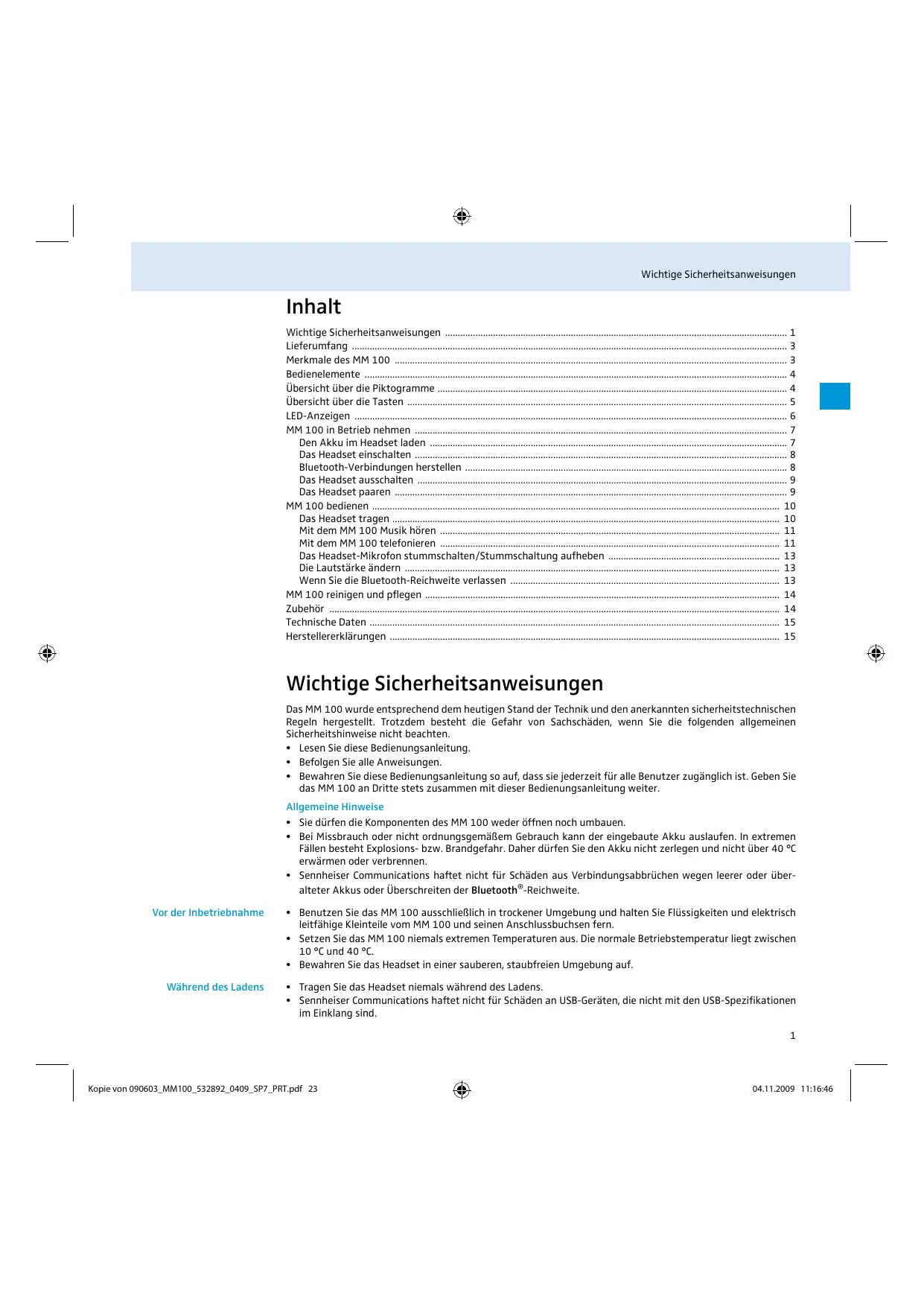 - Sennheiser Communications haftet nicht für Schäden aus Verbindungsabbrüchen wegen leerer oder überalteter Akkus oder Überschreiten der Bluetooth®-Reichweite. Vor der Inbetriebnahme