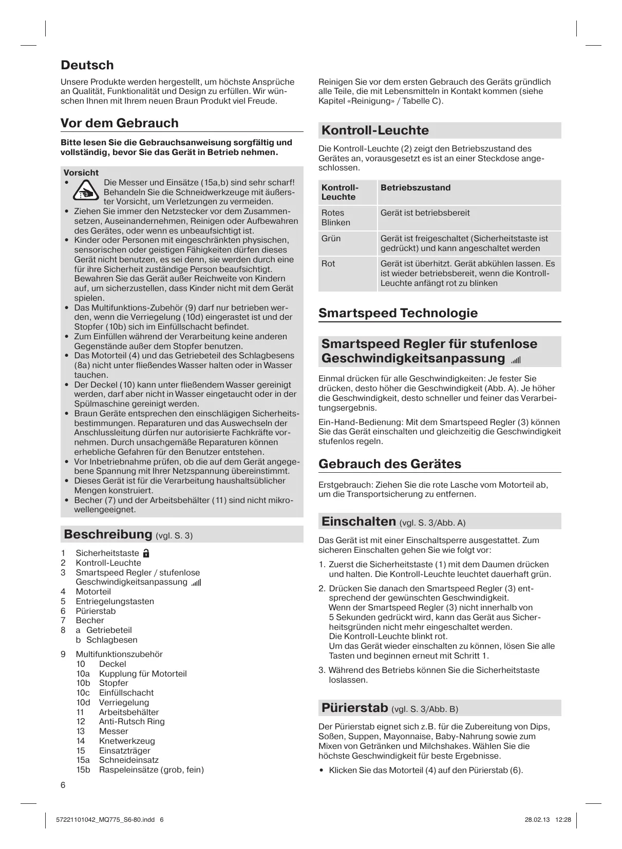 Deutsch Unsere Produkte werden hergestellt, um höchste Ansprüche an Qualität, Funktionalität und Design zu erfüllen. Wir wünschen Ihnen mit Ihrem neuen Braun Produkt viel Freude. Vor dem Gebrauch Bitte lesen Sie die Gebrauchsanweisung sorgfältig und vollständig, bevor Sie das Gerät in Betrieb nehmen. Vorsicht Die Messer und Einsätze (15a,b) sind sehr scharf! Behandeln Sie die Schneidwerkzeuge mit äußerster Vorsicht, um Verletzungen zu vermeiden.