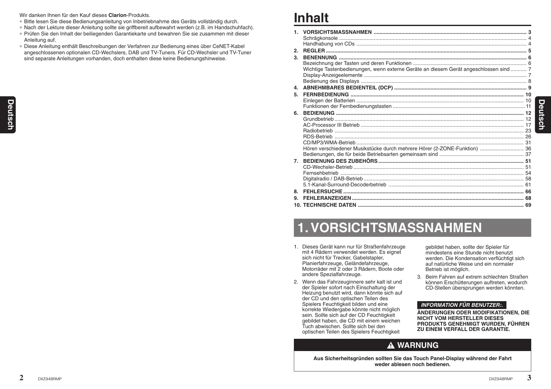 Wir danken Ihnen für den Kauf dieses Clarion-Produkts. + Bitte lesen Sie diese Bedienungsanleitung von Inbetriebnahme des Geräts vollständig durch.