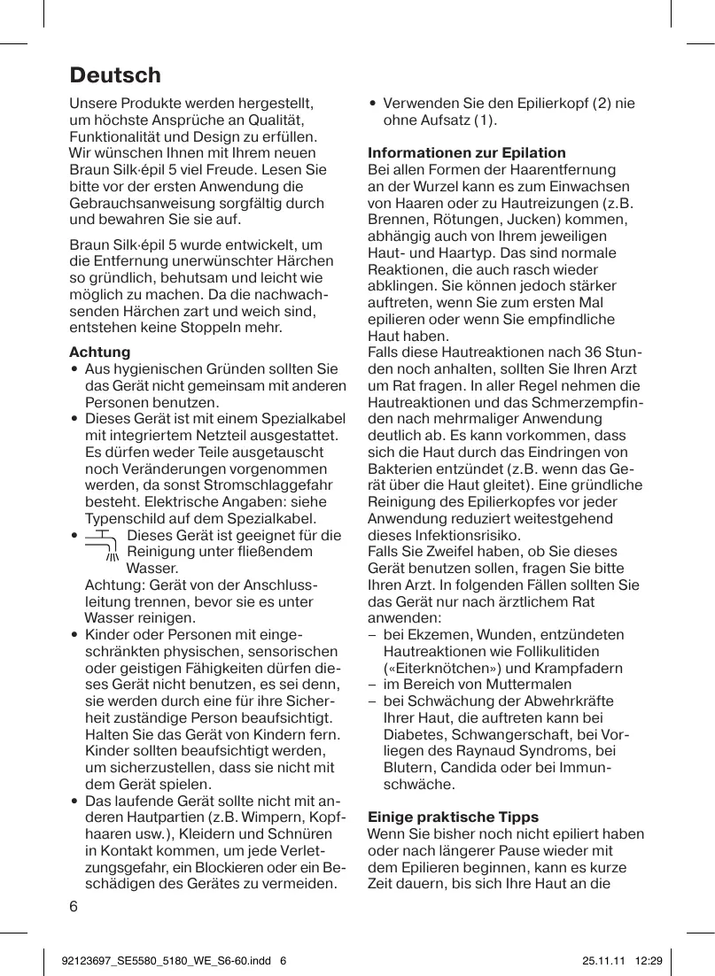 Deutsch Unsere Produkte werden hergestellt, um höchste Ansprüche an Qualität, Funktionalität und Design zu erfüllen. Wir wünschen Ihnen mit Ihrem neuen Braun Silk·épil 5 viel Freude. Lesen Sie bitte vor der ersten Anwendung die Gebrauchsanweisung sorgfältig durch und bewahren Sie sie auf. Braun Silk·épil 5 wurde entwickelt, um die Entfernung unerwünschter Härchen so gründlich, behutsam und leicht wie möglich zu machen. Da die nachwachsenden Härchen zart und weich sind, entstehen keine Stoppeln mehr. Achtung