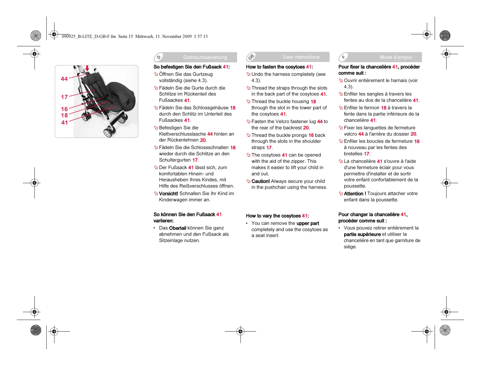 So können Sie den Fußsack 41 variieren: • Das Oberteil können Sie ganz abnehmen und den Fußsack als Sitzeinlage nutzen.