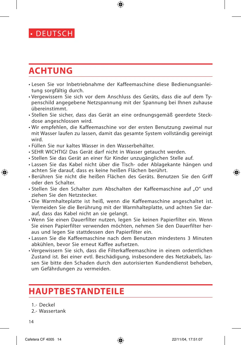 Cafetera CF 4005 15 22/11/04, 17:51:08 5). Lassen Sie nach dem Servieren den Ansatz wieder los, damit der restliche Kaffee in der Thermoskanne (6) warm bleibt.