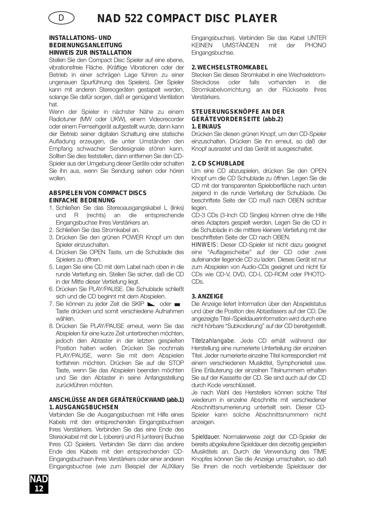 BEDIENUNGSANLEITUNG 522 NAD