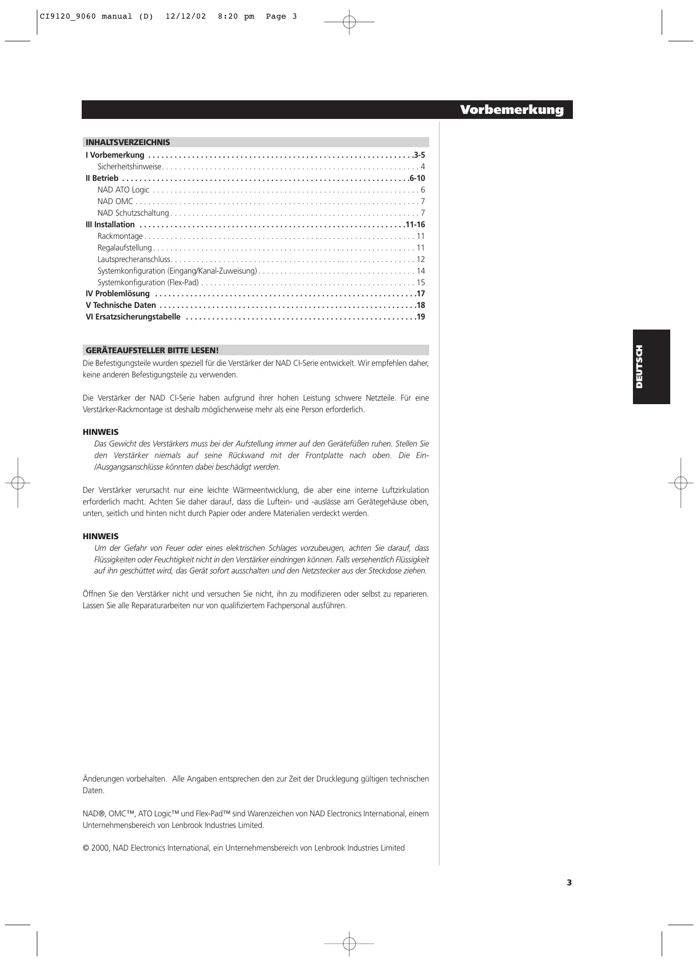 BEDIENUNGSANLEITUNG CI9120 NAD
