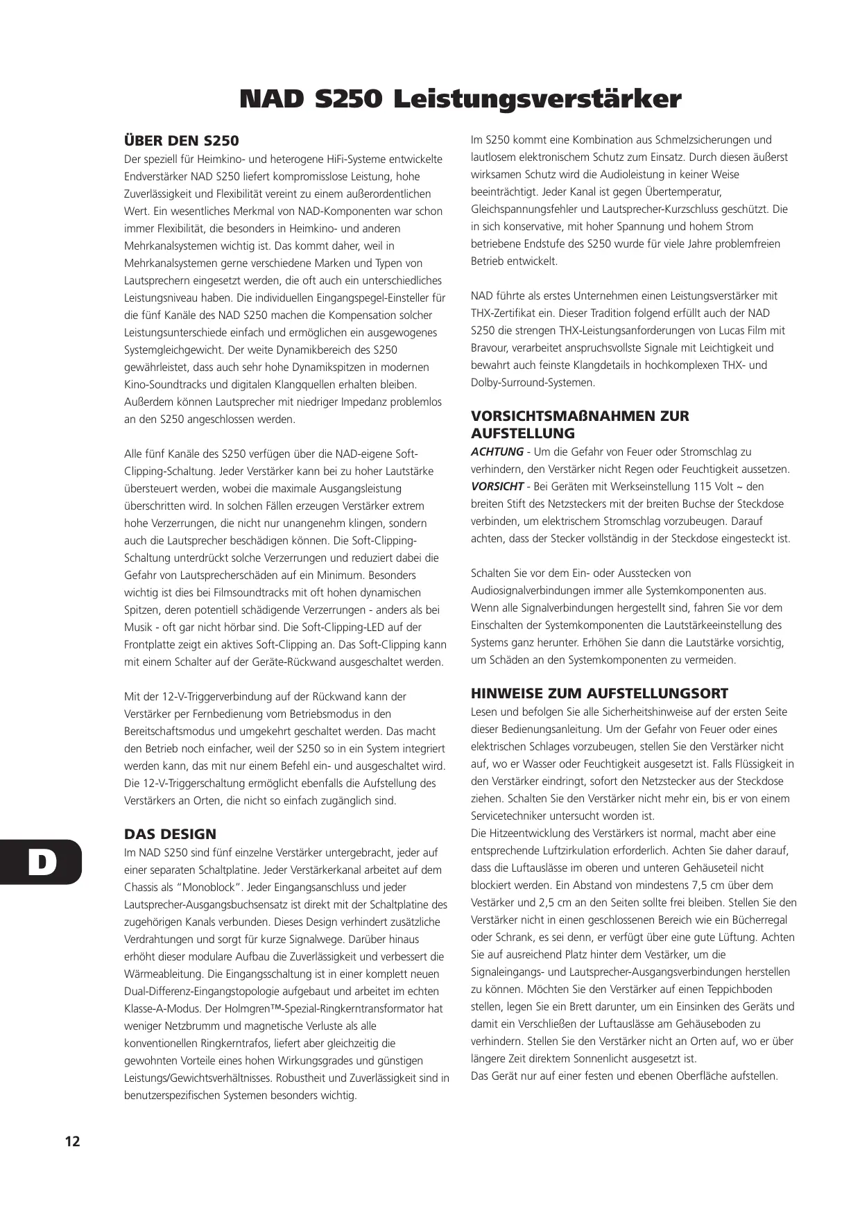 Der speziell für Heimkino- und heterogene HiFi-Systeme entwickelte Endverstärker NAD S250 liefert kompromisslose Leistung, hohe Zuverlässigkeit und Flexibilität vereint zu einem außerordentlichen Wert. Ein wesentliches Merkmal von NAD-Komponenten war schon immer Flexibilität, die besonders in Heimkino- und anderen Mehrkanalsystemen wichtig ist. Das kommt daher, weil in Mehrkanalsystemen gerne verschiedene Marken und Typen von Lautsprechern eingesetzt werden, die oft auch ein unterschiedliches Leistungsniveau haben. Die individuellen Eingangspegel-Einsteller für die fünf Kanäle des NAD S250 machen die Kompensation solcher Leistungsunterschiede einfach und ermöglichen ein ausgewogenes Systemgleichgewicht. Der weite Dynamikbereich des S250 gewährleistet, dass auch sehr hohe Dynamikspitzen in modernen Kino-Soundtracks und digitalen Klangquellen erhalten bleiben. Außerdem können Lautsprecher mit niedriger Impedanz problemlos an den S250 angeschlossen werden. VORSICHTSMAßNAHMEN ZUR AUFSTELLUNG ACHTUNG - Um die Gefahr von Feuer oder Stromschlag zu verhindern, den Verstärker nicht Regen oder Feuchtigkeit aussetzen. VORSICHT - Bei Geräten mit Werkseinstellung 115 Volt ~ den breiten Stift des Netzsteckers mit der breiten Buchse der Steckdose verbinden, um elektrischem Stromschlag vorzubeugen. Darauf achten, dass der Stecker vollständig in der Steckdose eingesteckt ist. Mit der 12-V-Triggerverbindung auf der Rückwand kann der Verstärker per Fernbedienung vom Betriebsmodus in den Bereitschaftsmodus und umgekehrt geschaltet werden. Das macht den Betrieb noch einfacher, weil der S250 so in ein System integriert werden kann, das mit nur einem Befehl ein- und ausgeschaltet wird. Die 12-V-Triggerschaltung ermöglicht ebenfalls die Aufstellung des Verstärkers an Orten, die nicht so einfach zugänglich sind.