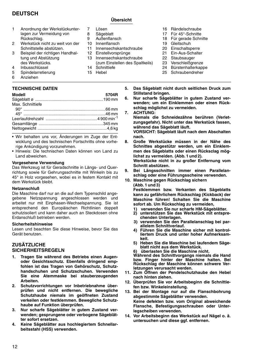 - Lösen Sägeblatt Außenflansch Innenflansch Innensechskantschraube Einstellvorsprünge Innensechskantschraube (zum Einstellen des Spaltkeils) 14 Schnittiefe 15 Hebel TECHNISCHE DATEN Modell 5704R Sägeblatt ø p. 190