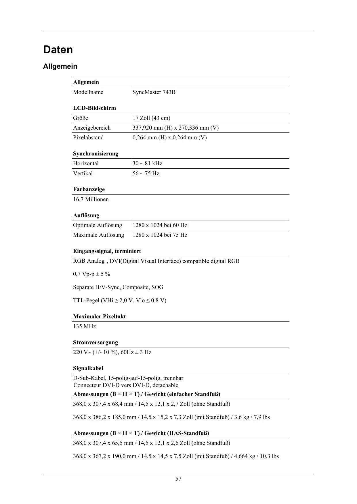 Daten Allgemein Allgemein Modellname SyncMaster 743B LCD-Bildschirm Größe 17 Zoll (43 cm) Anzeigebereich 337,920 mm (H) x 270,336 mm (V) Pixelabstand 0,264 mm (H) x 0,264 mm (V) Synchronisierung Horizontal 30 ~ 81 kHz Vertikal 56 ~ 75 Hz Farbanzeige 16,7 Millionen Auflösung Optimale Auflösung 1280 x 1024 bei 60 Hz Maximale Auflösung 1280 x 1024 bei 75 Hz Eingangssignal, terminiert RGB Analog , DVI(Digital Visual Interface) compatible digital RGB 0,7 Vp-p ± 5 % Separate H/V-Sync, Composite, SOG TTL-Pegel (VHi ≥ 2,0 V, Vlo ≤ 0,8 V) Maximaler Pixeltakt 135 MHz Stromversorgung 220 V~ (+/- 10 %), 60Hz ± 3 Hz Signalkabel D-Sub-Kabel, 15-polig-auf-15-polig, trennbar Connecteur DVI-D vers DVI-D, détachable Abmessungen (B × H × T) / Gewicht (einfacher Standfuß) 368,0 x 307,4 x 68,4 mm / 14,5 x 12,1 x 2,7 Zoll (ohne Standfuß) 368,0 x 386,2 x 185,0 mm / 14,5 x 15,2 x 7,3 Zoll (mit Standfuß) / 3,6 kg / 7,9 lbs Abmessungen (B × H × T) / Gewicht (HAS-Standfuß) 368,0 x 307,4 x 65,5 mm / 14,5 x 12,1 x 2,6 Zoll (ohne Standfuß) 368,0 x 367,2 x 190,0 mm / 14,5 x 14,5 x 7,5 Zoll (mit Standfuß) / 4,664 kg / 10,3 lbs