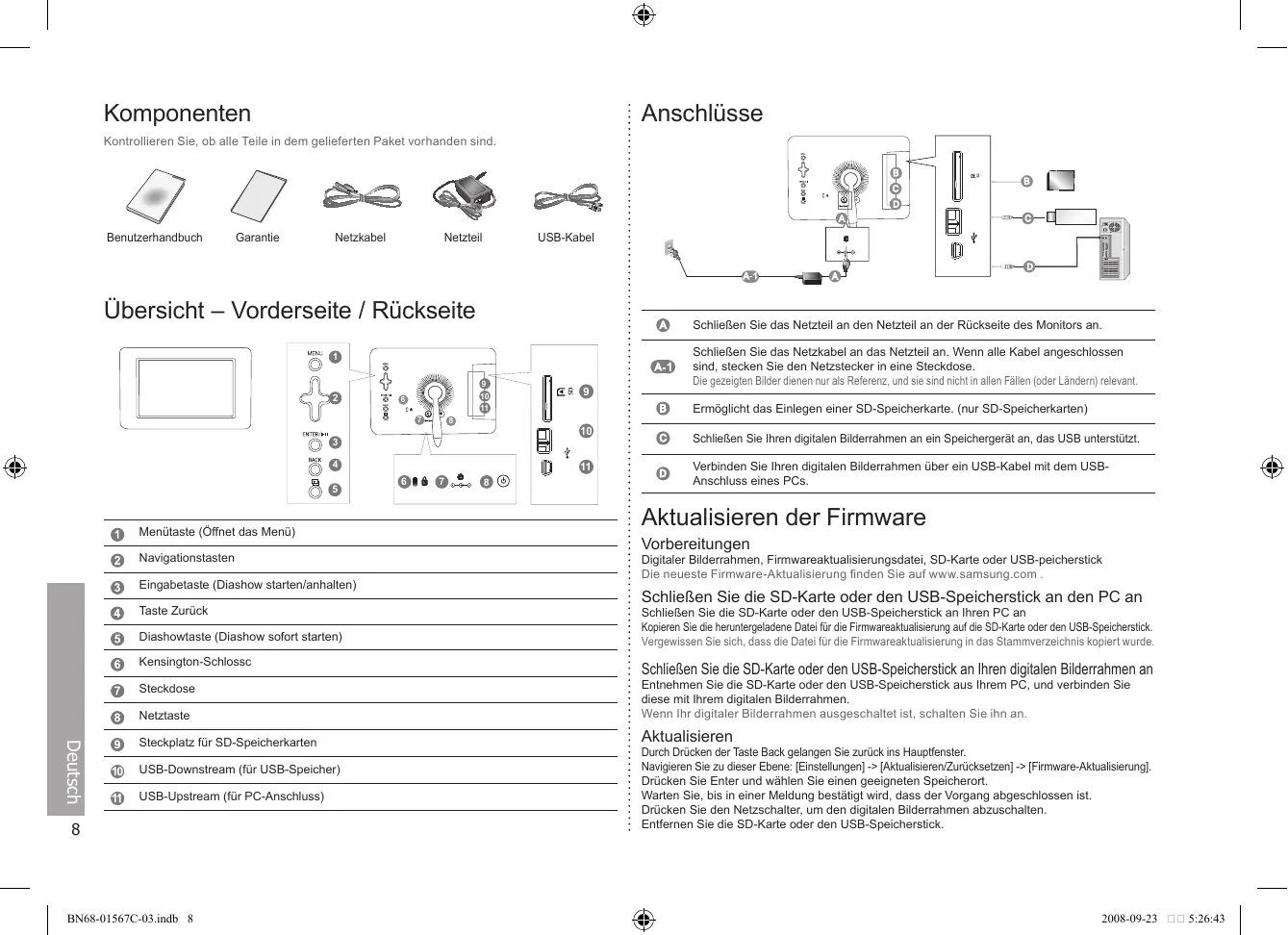 Schließen Sie das Netzkabel an das Netzteil an. Wenn alle Kabel angeschlossen sind, stecken Sie den Netzstecker in eine Steckdose. Die gezeigten Bilder dienen nur als Referenz, und sie sind nicht in allen Fällen (oder Ländern) relevant. Schließen Sie Ihren digitalen Bilderrahmen an ein Speichergerät an, das USB unterstützt. Verbinden Sie Ihren digitalen Bilderrahmen über ein USB-Kabel mit dem USBAnschluss eines PCs. Aktualisieren der Firmware Vorbereitungen Digitaler Bilderrahmen, Firmwareaktualisierungsdatei, SD-Karte oder USB-peicherstick Die neueste Firmware-Aktualisierung finden Sie auf www.samsung.com . Schließen Sie die SD-Karte oder den USB-Speicherstick an den PC an Schließen Sie die SD-Karte oder den USB-Speicherstick an Ihren PC an Kopieren Sie die heruntergeladene Datei für die Firmwareaktualisierung auf die SD-Karte oder den USB-Speicherstick. Vergewissen Sie sich, dass die Datei für die Firmwareaktualisierung in das Stammverzeichnis kopiert wurde. Schließen Sie die SD-Karte oder den USB-Speicherstick an Ihren digitalen Bilderrahmen an Netztaste Entnehmen Sie die SD-Karte oder den USB-Speicherstick aus Ihrem PC, und verbinden Sie diese mit Ihrem digitalen Bilderrahmen. Wenn Ihr digitaler Bilderrahmen ausgeschaltet ist, schalten Sie ihn an. Steckplatz für SD-Speicherkarten Aktualisieren Steckdose Deutsch USB-Downstream (für USB-Speicher) USB-Upstream (für PC-Anschluss)